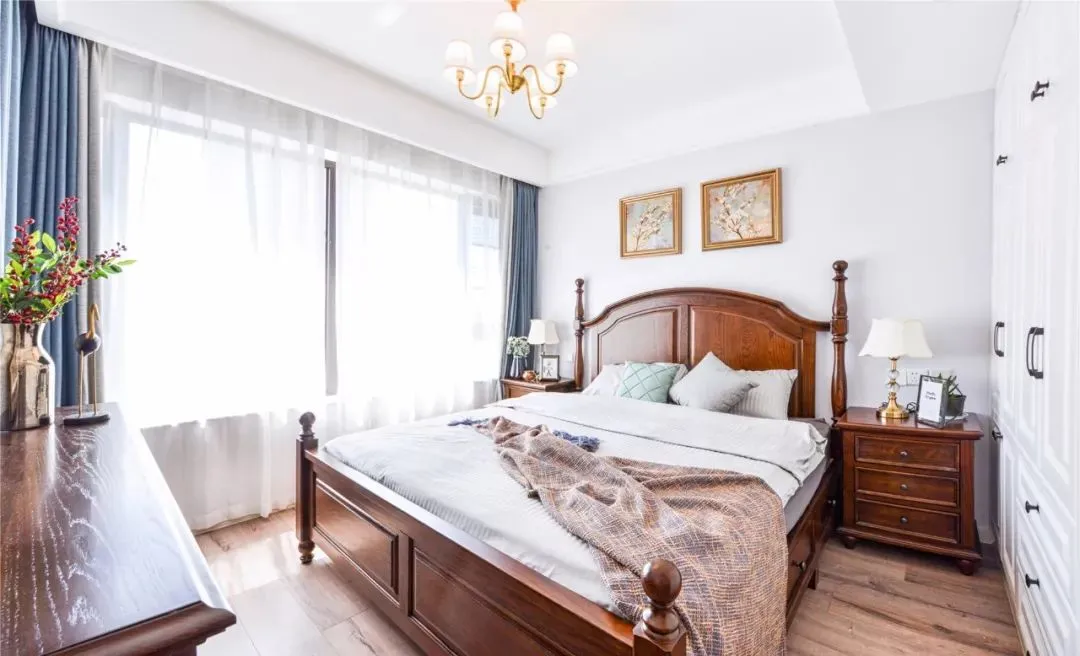On the basis of simple hard decoration, a white wardrobe is selected, with wooden bed and bedside table, and then embellished with blue curtains, decorative paintings, photo frames, flower arrangements, etc., to present a warm and stylish bedroom.