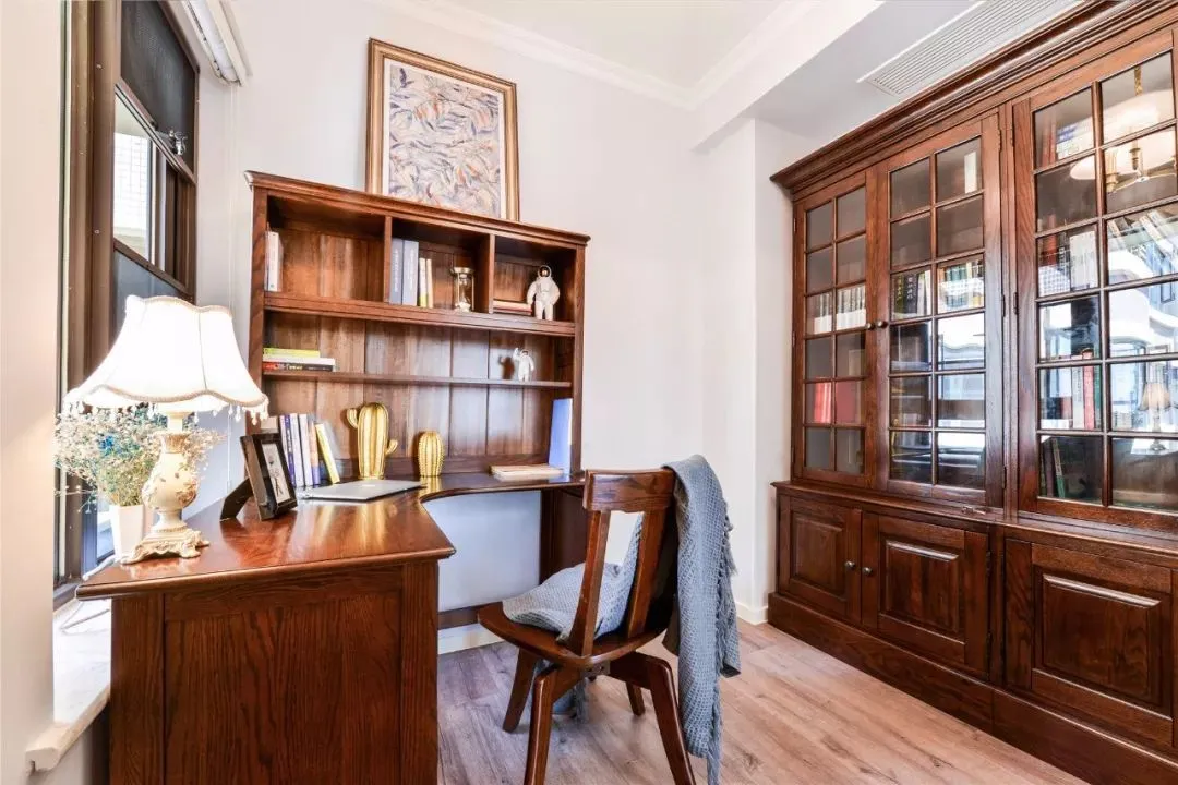 The host needs an independent office area, and this study is tailor-made for him. Dark solid wood desks and bookcases appear calm and textured, and the walls are painted with light latex paint to create a quiet and focused working atmosphere.