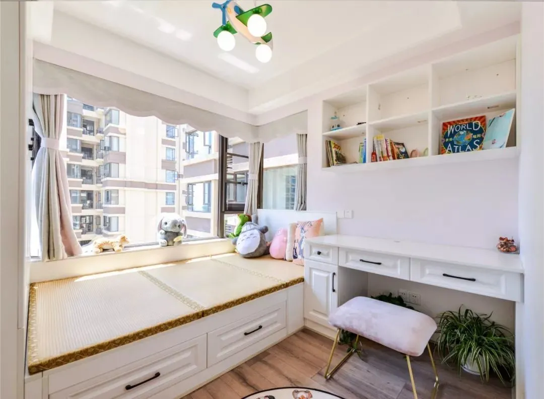 The customized combination of desk and bookshelf is convenient for children to read picture books, write and draw here.