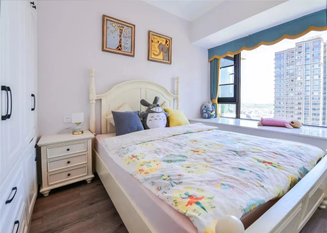 The design of the second bedroom is younger and fashionable, which may be due to the choice of light-colored furniture and yellow and blue curtains. The chinchilla doll on the bed adds a playful and childlike interest to the space.