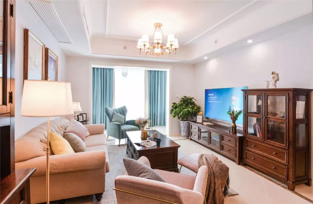 Comfortable American fabric sofa, with dark furniture, and a TV cabinet with high and low combination, adorned with a pot of green plants. Even if the hard part is not too decorated, the whole living room is particularly warm and comfortable.