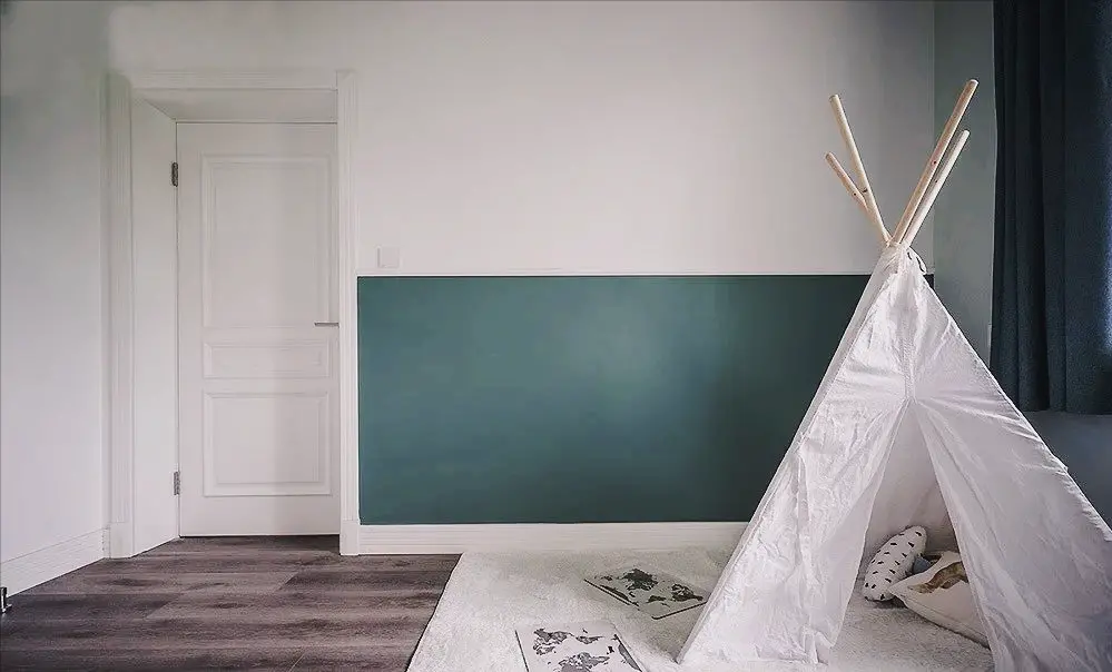 In order to match the overall green tone of the children’s room, the wall is also painted with dark green blackboard paint.