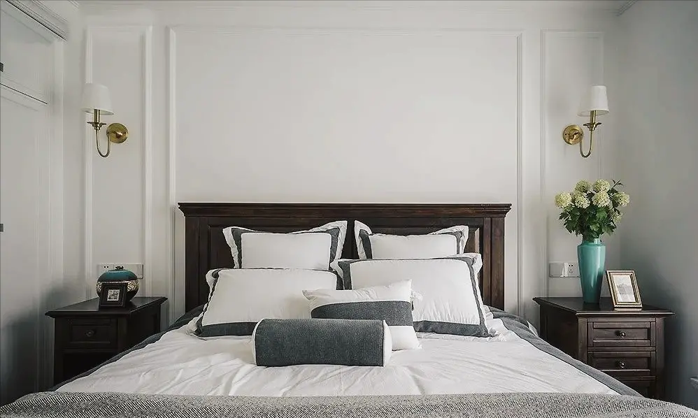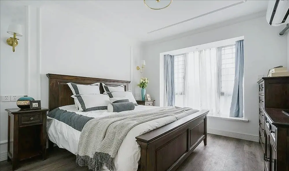 The master bedroom continues the style of the living room, with a solid wood bed with dark wood color and soft decoration with American details. The whole space is immersed in a dignified and soft atmosphere.