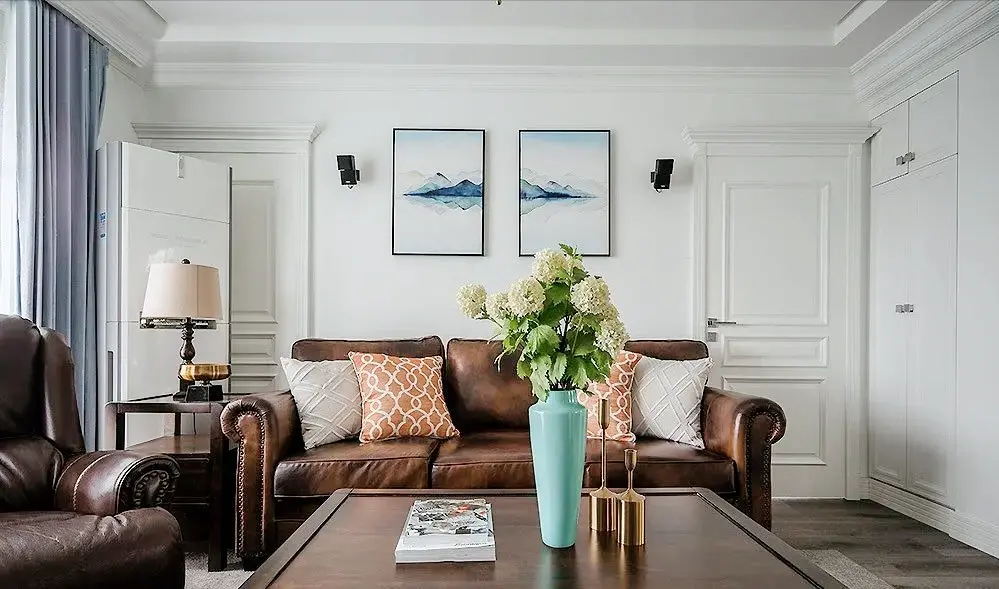 Dark brown leather sofa, with rivet details, looks generous and elegant. The decorative painting on the sofa wall adds to the artistic conception and beauty and plays a finishing touch.