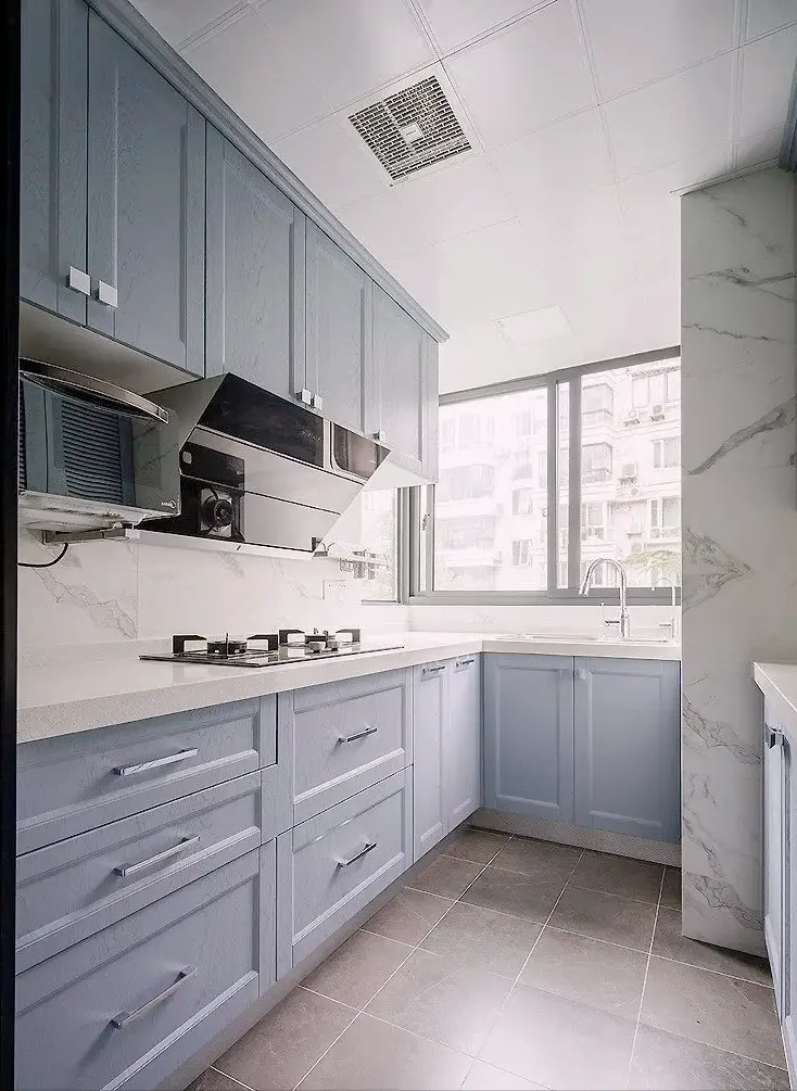The kitchen is embellished with jazz white wall tiles, echoing the blue-gray cabinet panels and enhancing the overall texture.
