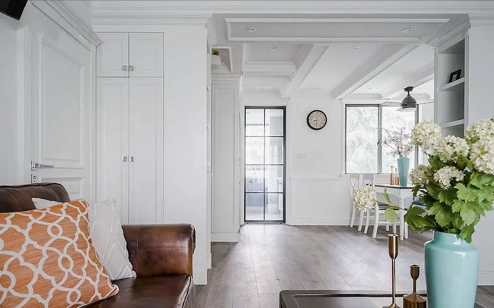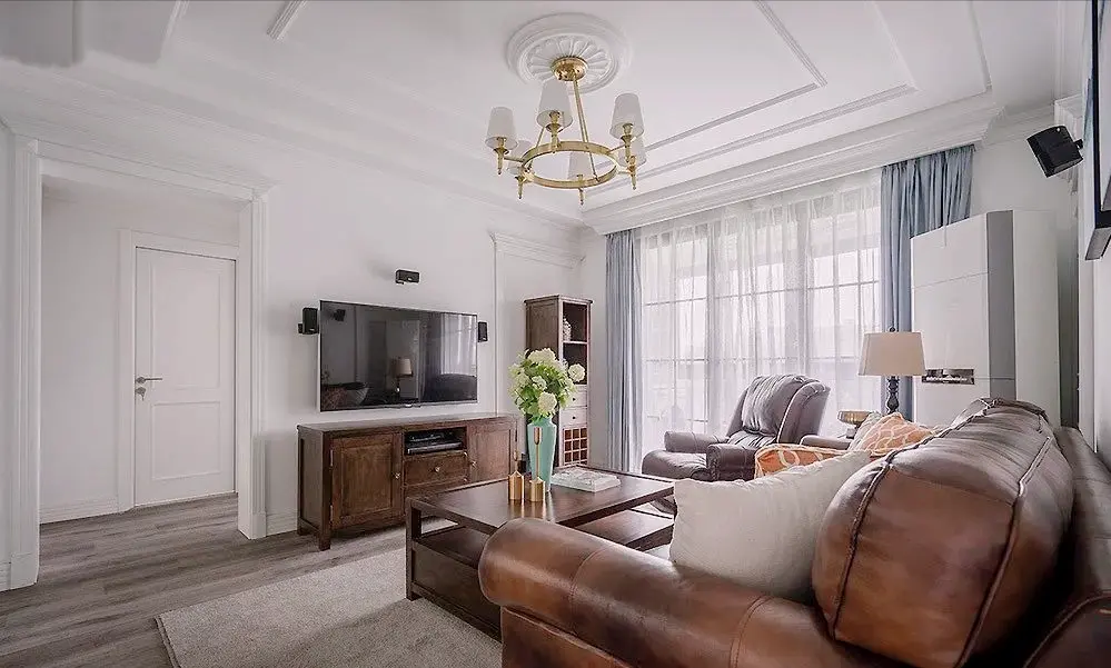 The living room is based on white, and the walls and ceilings are decorated with exquisite plaster lines. Grey curtains bring a sense of tranquility and cleanliness to the space.