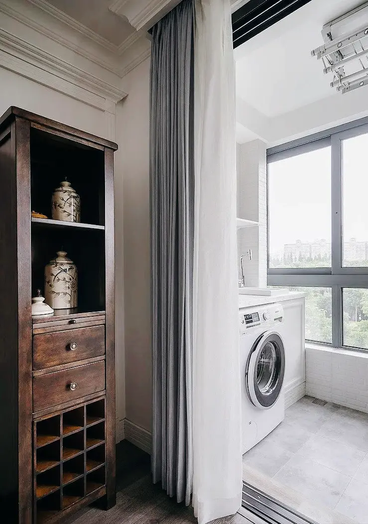 A washing machine is placed on the balcony, which not only saves space, but also facilitates drying clothes.