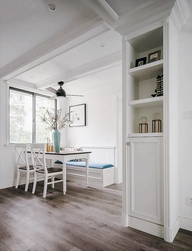 A row of cards with storage function is designed on the side of the dining table against the wall, which not only increases the storage space, but also makes the restaurant look more transparent and spacious.