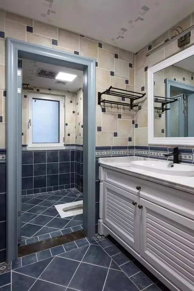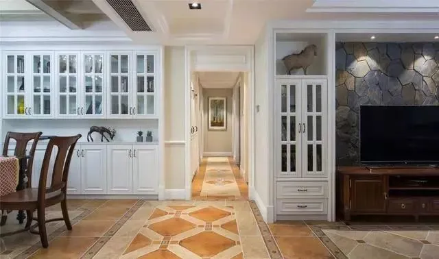 A built-in white shoe cabinet is customized on the side of the entrance against the wall, and then the floor is paved with antique floor tiles, and then matched with American-style furniture, giving people a bright visual enjoyment ~
