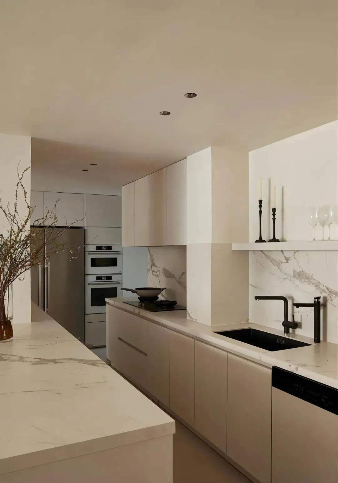The stove is set behind the load-bearing column, and is equipped with a hidden range hood, which keeps the vision clean and refreshing. The storage cabinet continues from the dining room to the kitchen, and the refrigerator and steam oven are properly embedded in it.