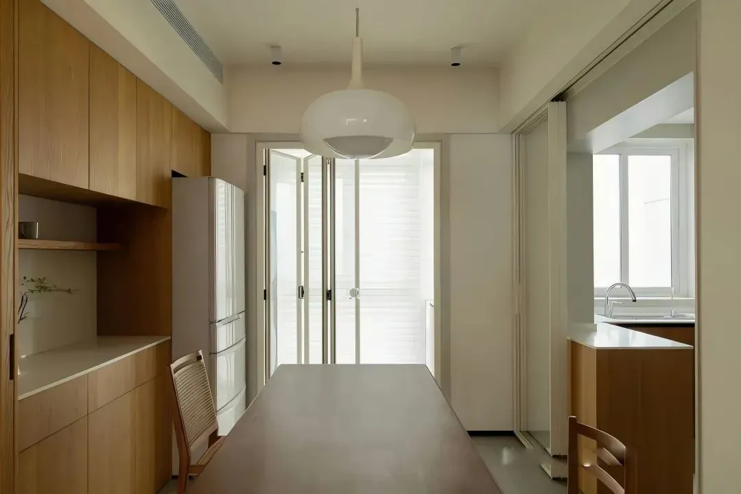 The walnut dining table and chairs are classic and rich in texture, and a cream chandelier lights up the style of dining. Double/triple sliding doors cleverly divide the dining area and washing area; The customized sideboard takes into account both storage and display functions.