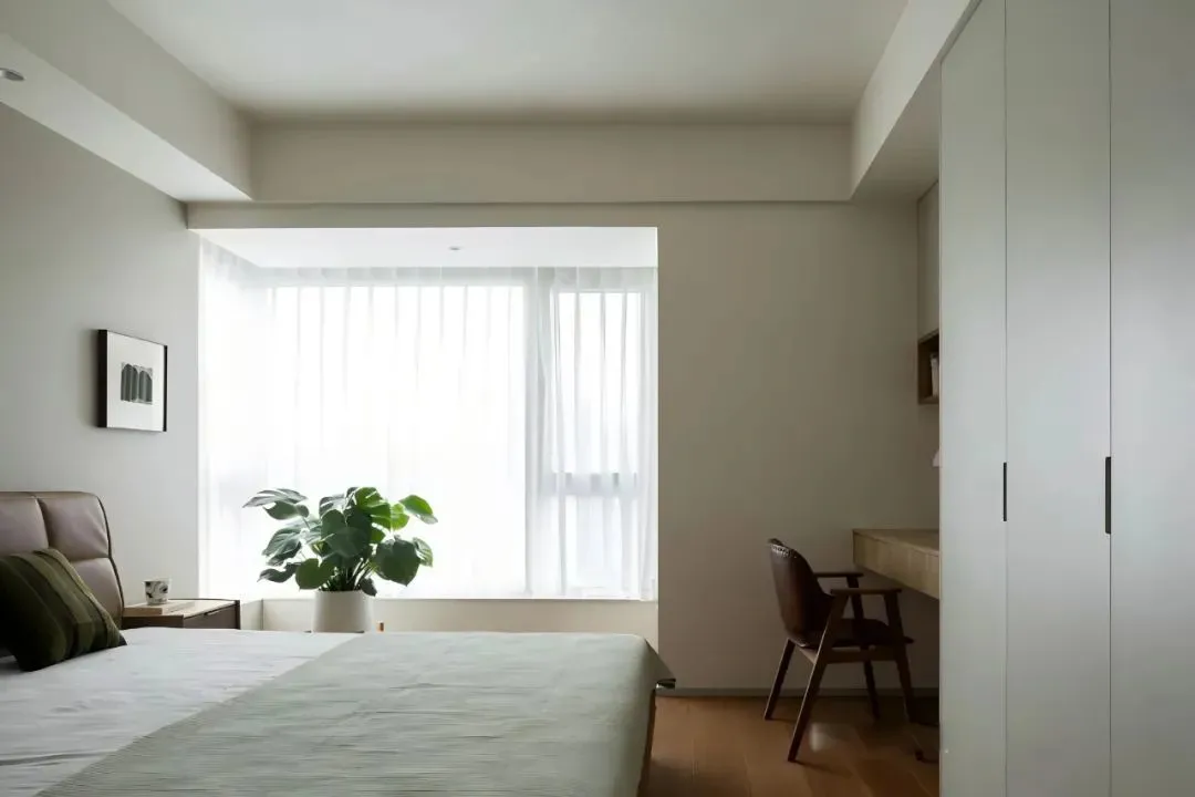 The master bedroom continues the low saturation color scheme, which is physically and mentally relaxing. A desk position is reserved in the corner to meet the needs of occasional office or reading.