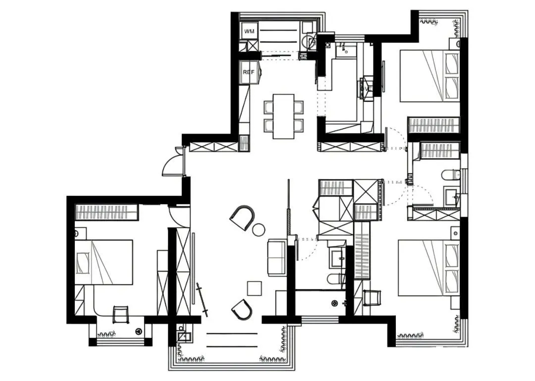 The overall space of this 150 ㎡ three-bedroom and two-bathroom case reflects the owner’s elegant and restrained taste. The design of log style reveals a bit of Zen, creating a soft and quiet home atmosphere, and the whole house presents a natural and warm style.