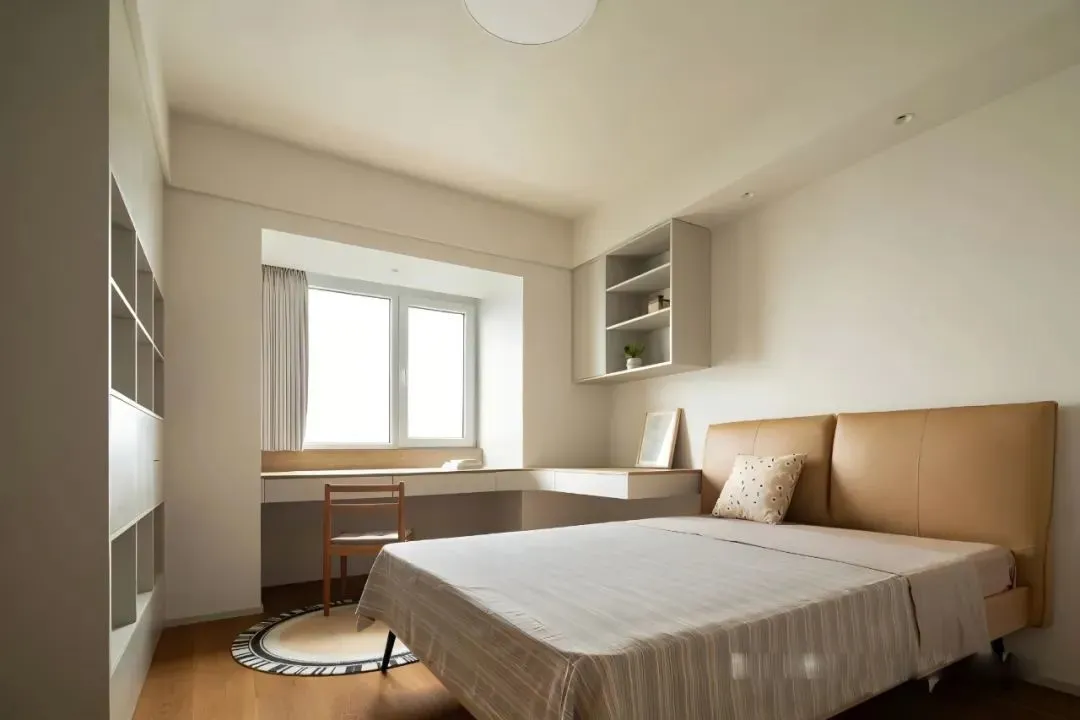 The second bedroom makes full use of the original apartment structure, and designs a suspended desk along the window, which extends to the bedside to meet the needs of daily storage and learning. The corners are softly curved. The upper hanging cabinet is equipped with an open compartment, which is convenient for storing books and small ornaments.