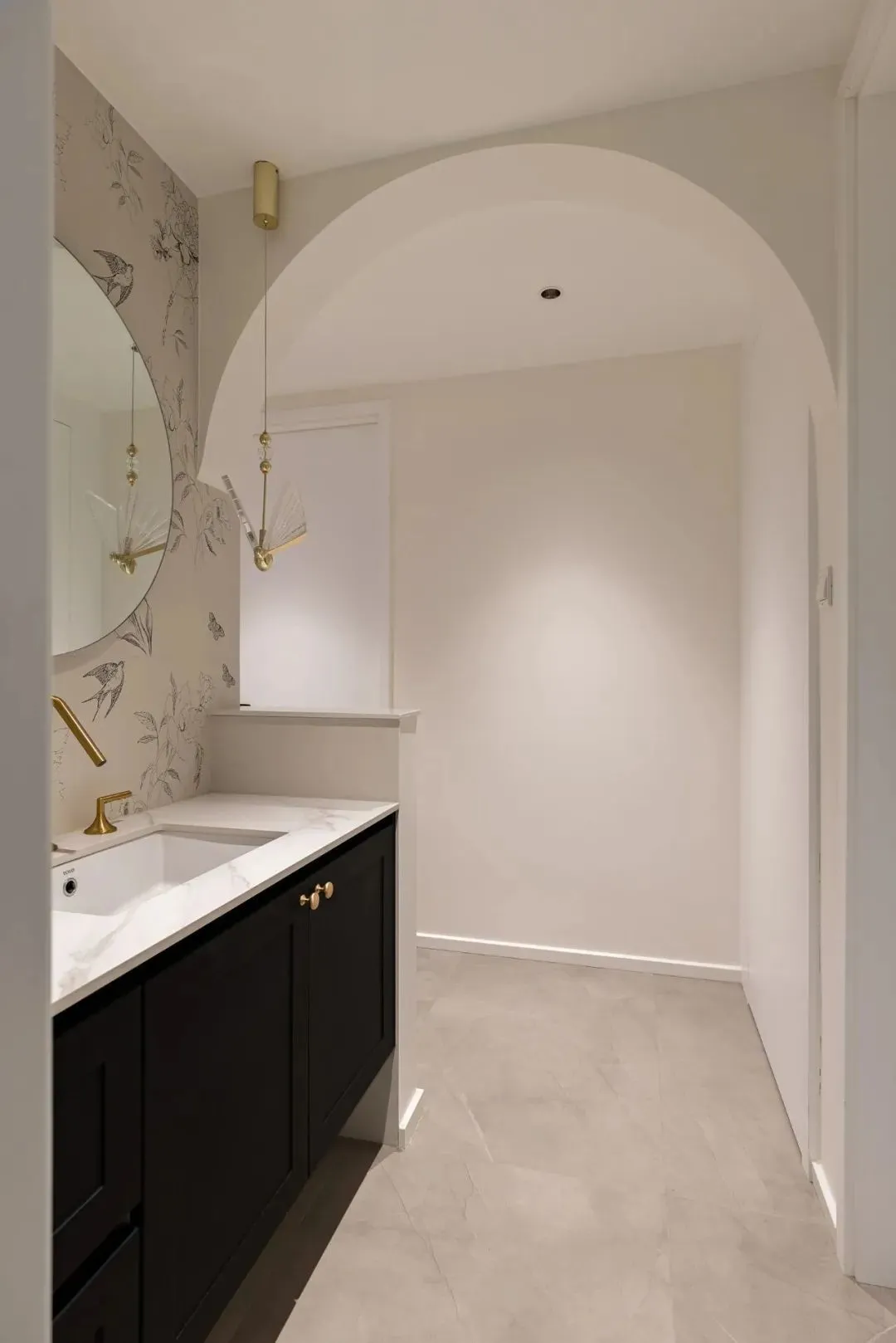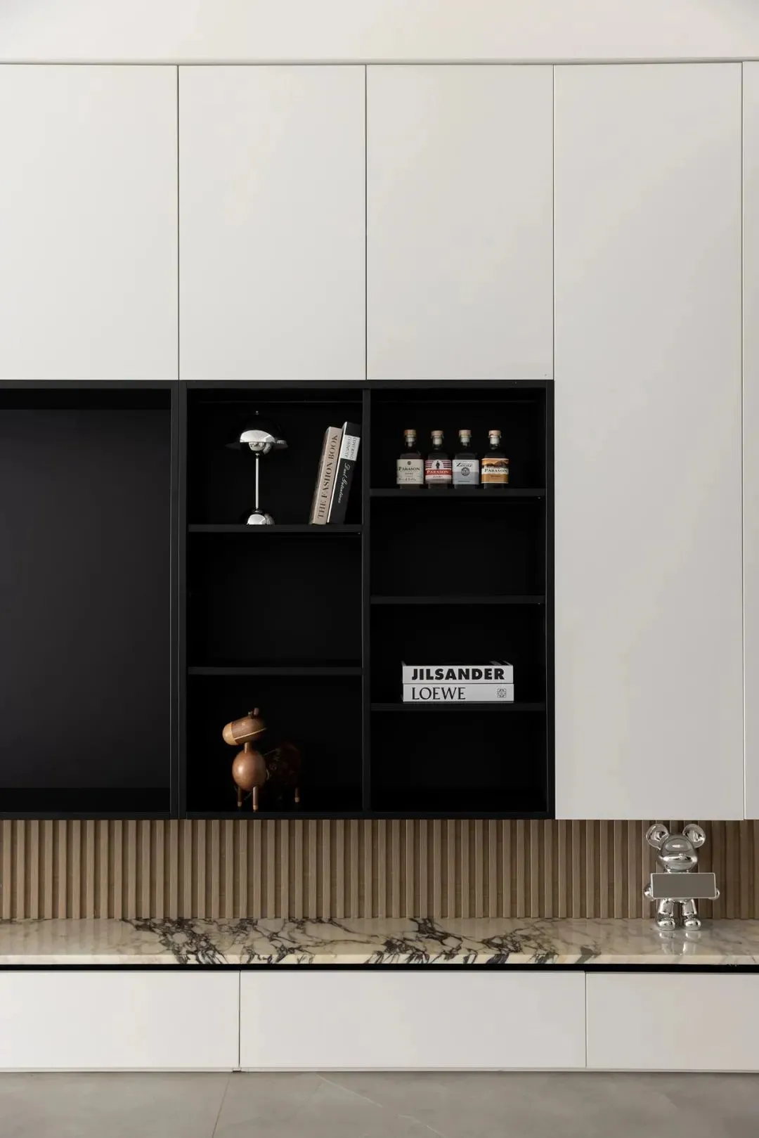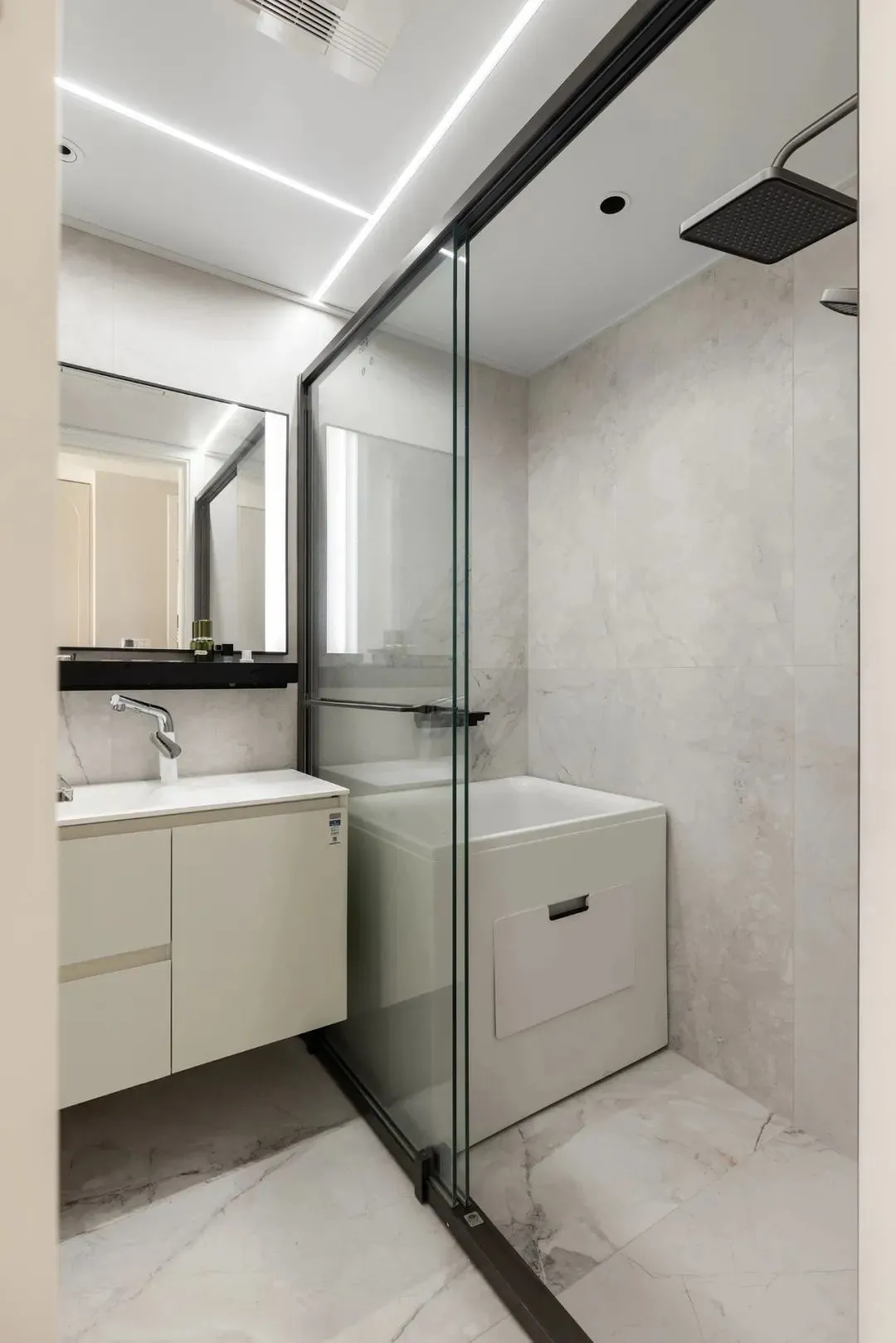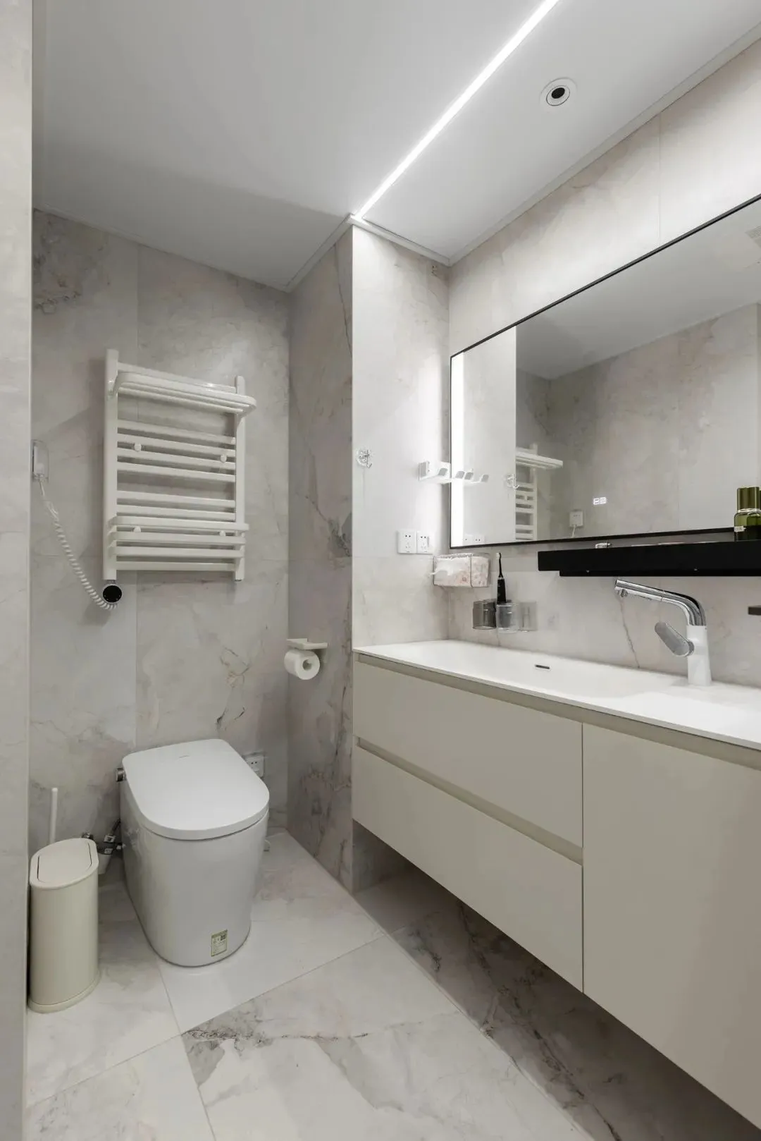 Under the minimalist tone, lighting, as a rare decorative element, renders the atmosphere and temperament just right, and hidden linear lights also add some imagination to the space.