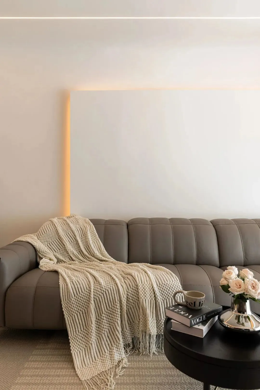 Italian piano key sofa is matched with a black rotating wood grain small round table. The back of the sofa is made of decorative wall and embedded light source. A floor lamp is arranged in the corner, and the floor is covered with a light-colored carpet, which makes the space full of comfort and elegance.