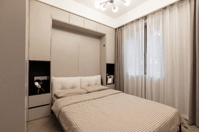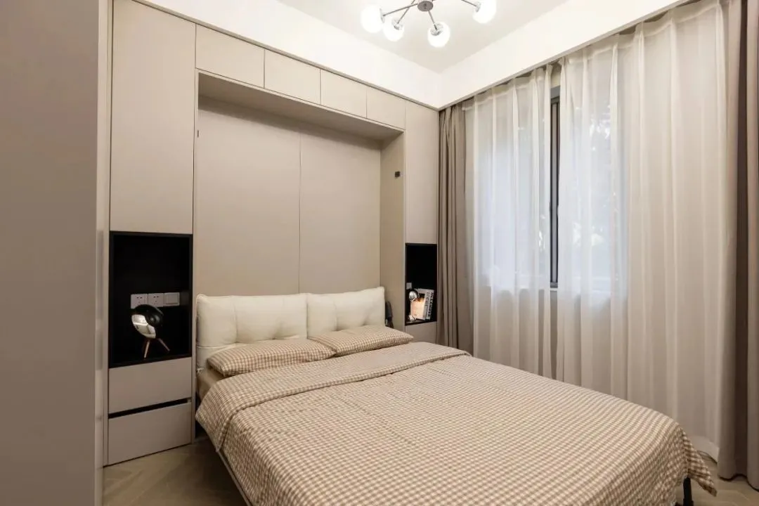 The small second bedroom is used as a multi-purpose room, and the Murphy bed is customized. It is hidden in the wall, put down when needed, put away when not in use, and make the bed “disappear” with one click!