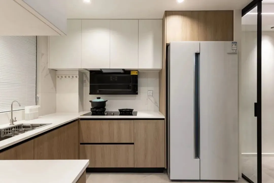 The kitchen adopts a U-shaped layout to maximize the use of space, and custom cabinets meet the kitchen storage needs. Through the combination of logs and white, the space is endowed with a refreshing temperament and a warm sense of healing.
