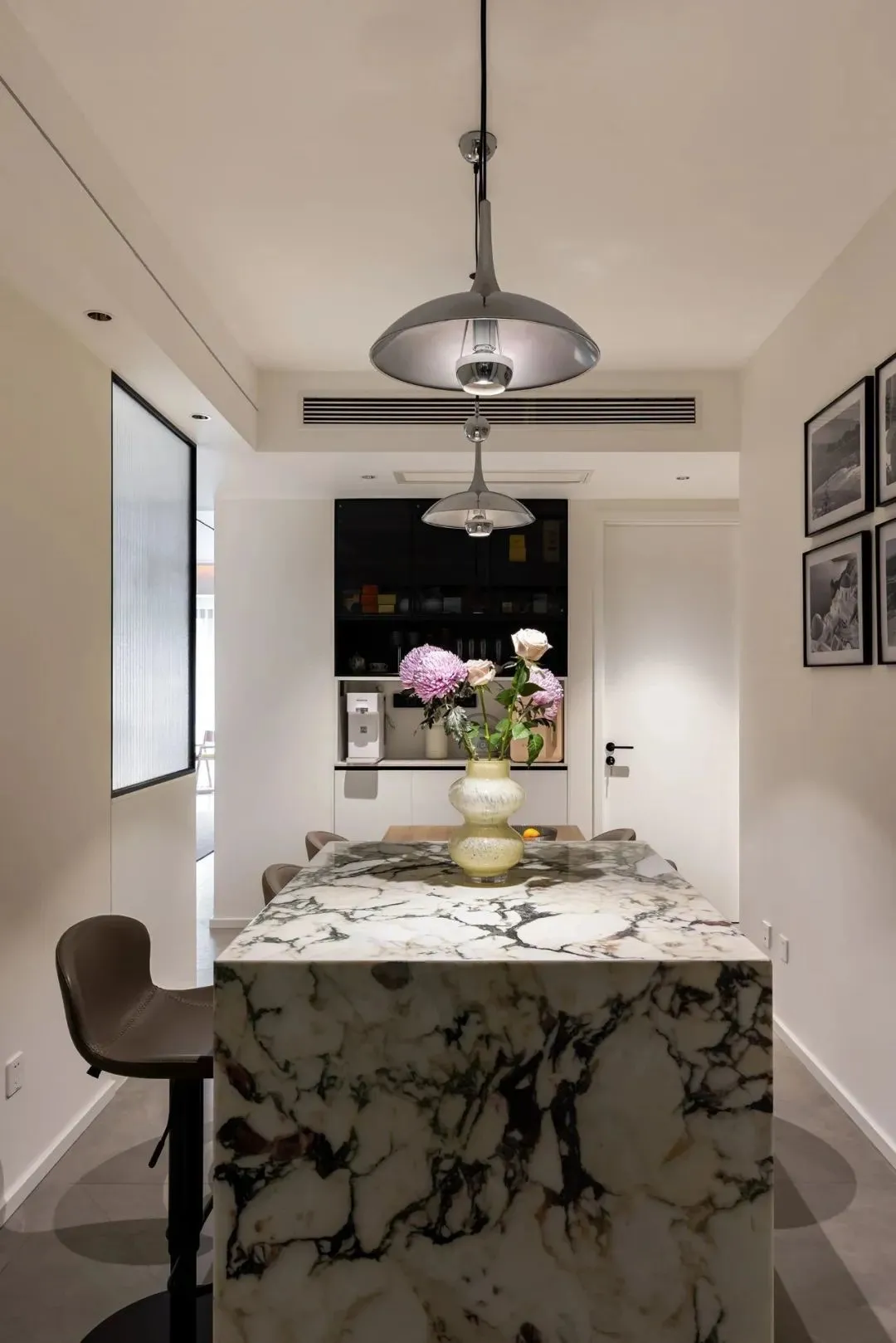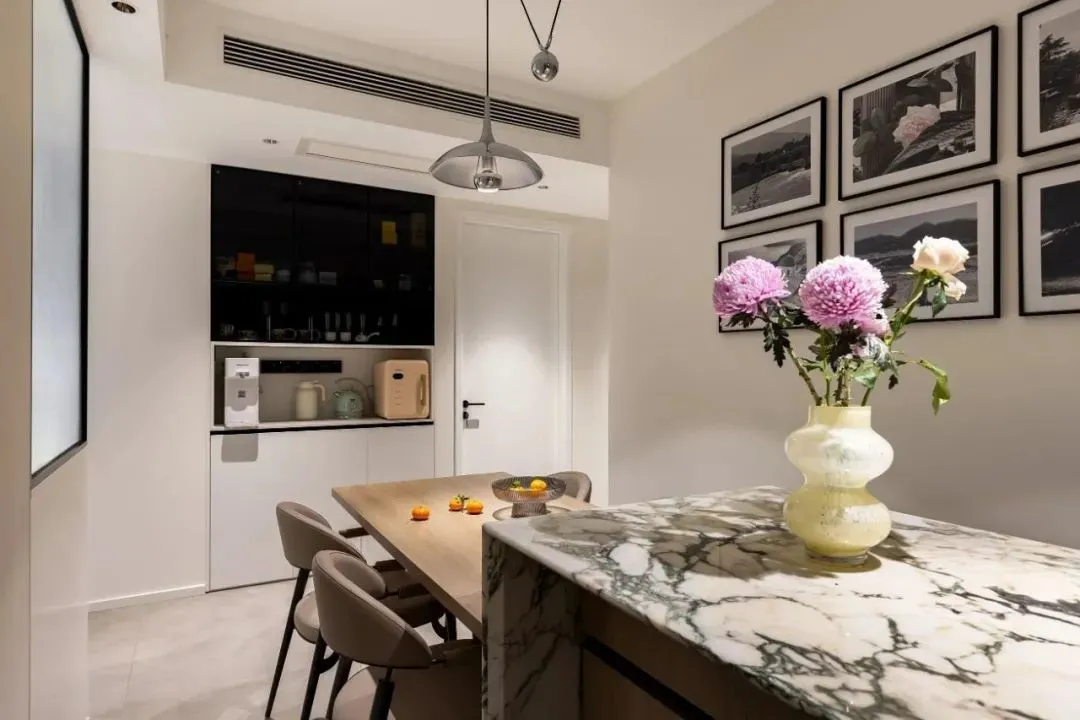 The island platform and dining table are customized in the center of the restaurant, forming a zigzag moving line, which makes daily actions more convenient. The marble island countertop is matched with the wooden dining table countertop, which sets off each other calmly and warmly, balances the overall tonality, enriches the visual elements while grasping the texture, and creates an elegant and warm dining environment.