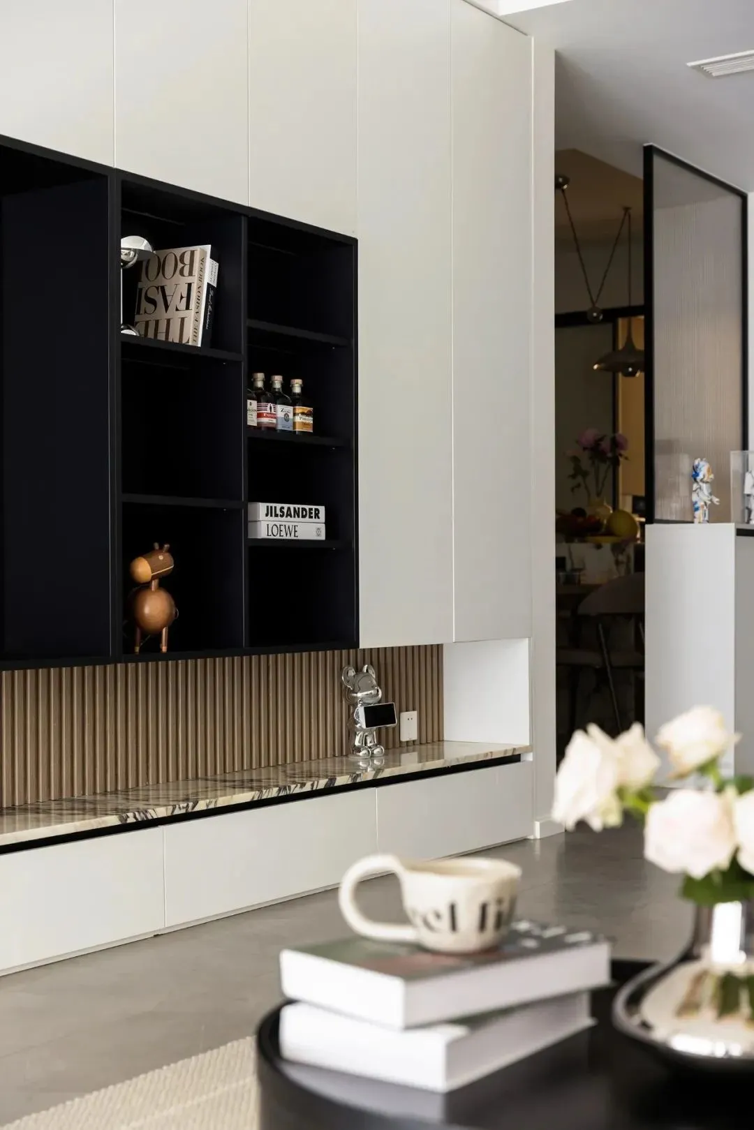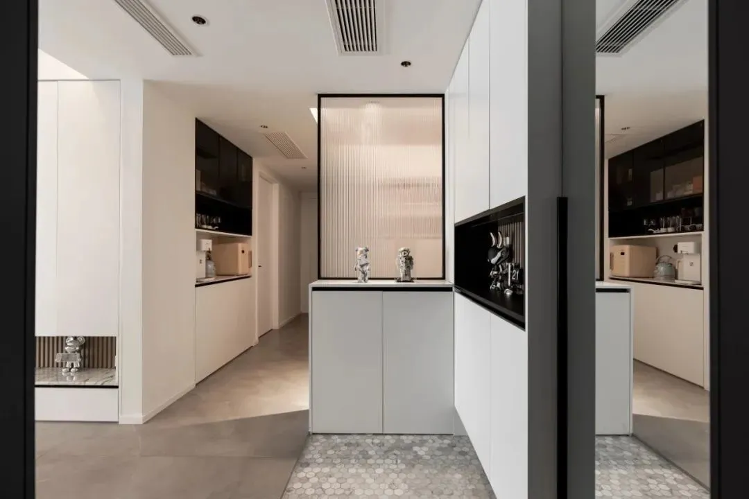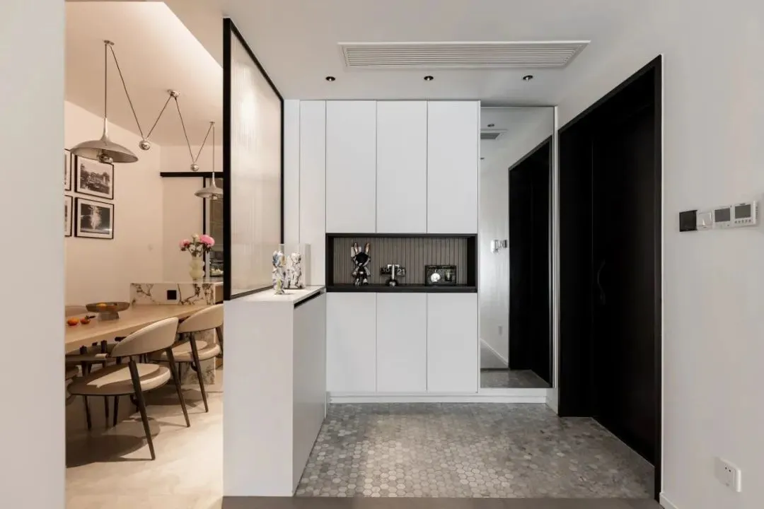 Parallel to the position of the entrance door, the lower cabinet is customized with glass partition, which not only has storage function, but also does not affect lighting. Through the frosted glass, the looming hazy light and shadow warms the people who come home.