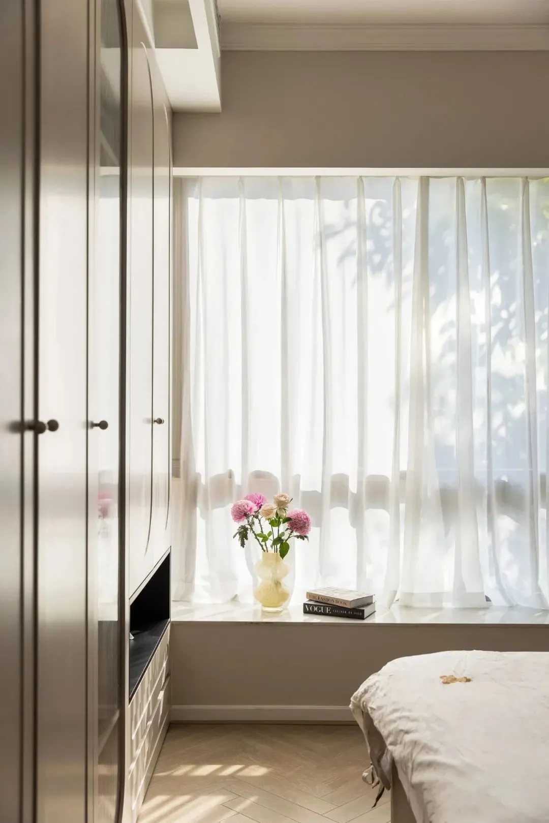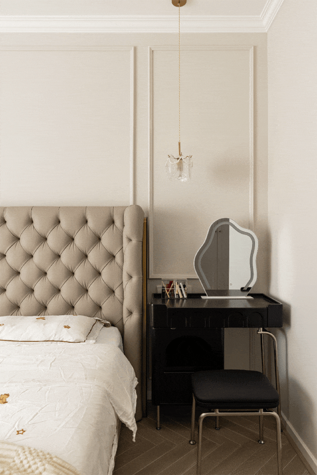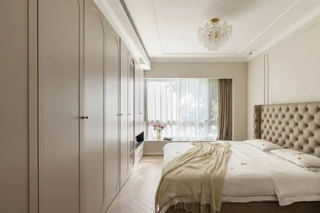 The whole wall wardrobe is customized at the end of the bed. The simple French shape injects a touch of vitality into the space, and at the same time, it is convenient to store clothes, bedding and accessories for all seasons, which is beautiful and practical.