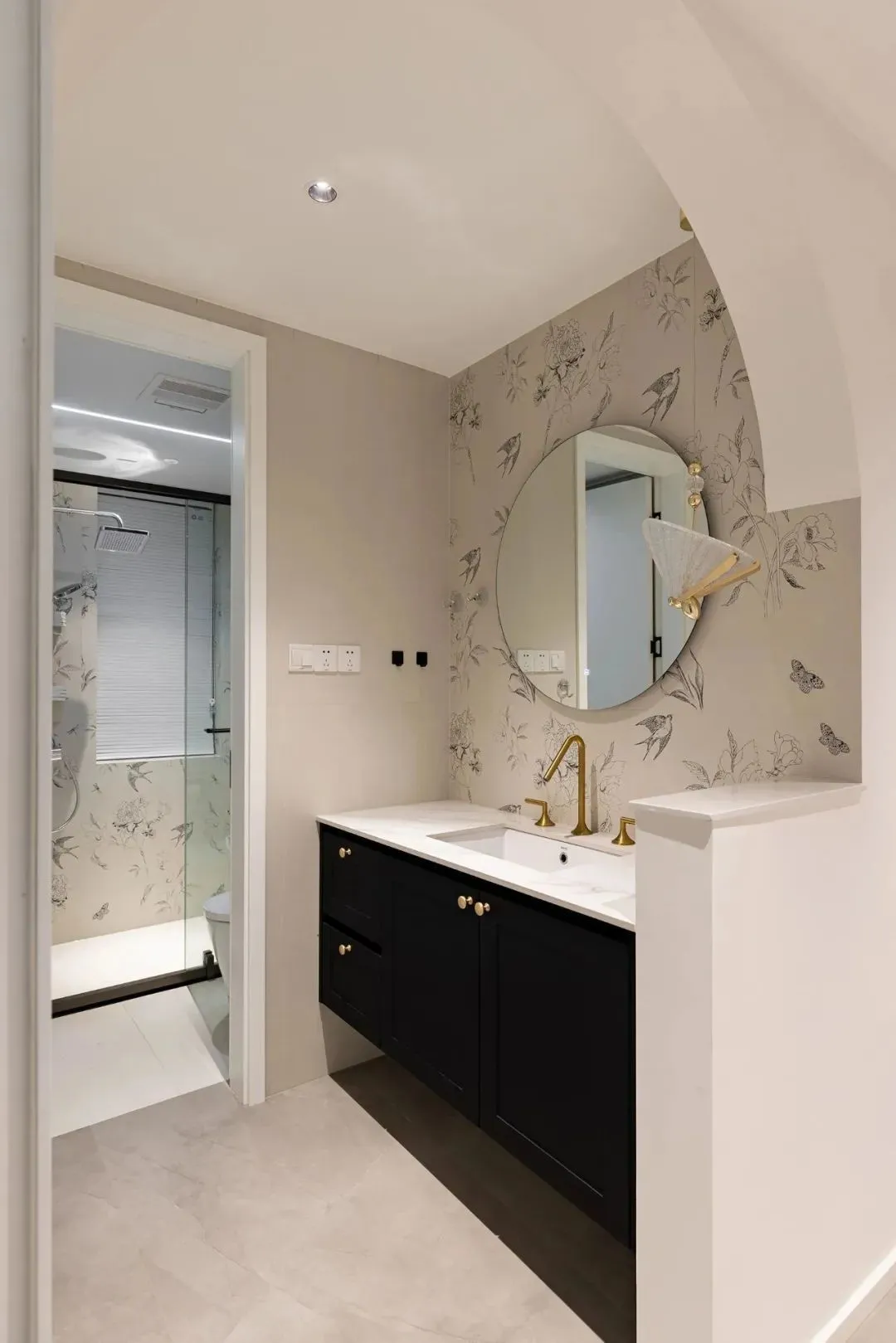 The washstand was moved out, and a lot of thought was spent on the design. Small tiles are placed on the wall, and half the wall is built as a partition, which not only ensures beauty and a certain line of sight block, but also retains the sense of space transparency. The design of leaving empty against the wall adds to the sense of breathing.