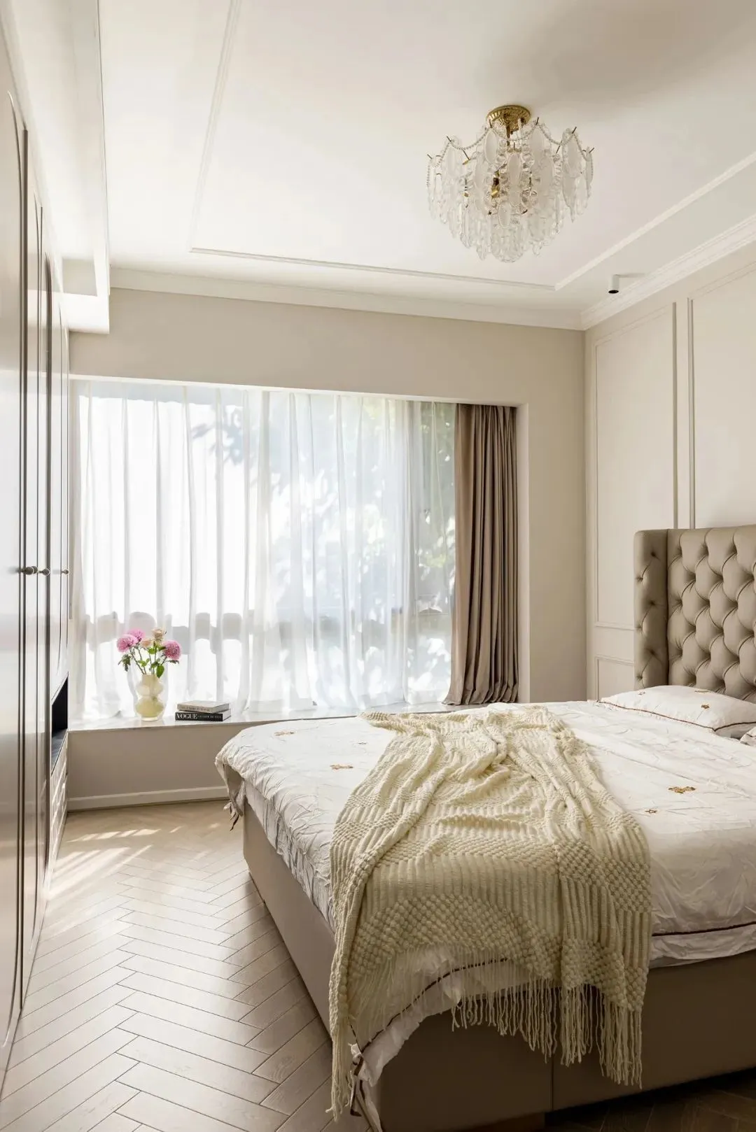 The bedroom also continues the French design style, and soft furnishings such as bedding and curtains are made of light tones with low saturation, creating a clean and comfortable sleeping environment.