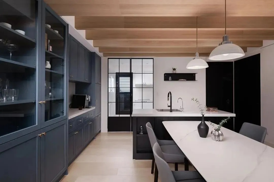 Nakajima can not only be used as a simple meal preparation table, but also cleverly form an interactive workspace. Here, families can look after children while dealing with business, or communicate with family members busy in the kitchen. The VIPP black shelf specially set at the rear complements the kitchen glass sliding door, taking into account both display and storage, creating a fashionable and practical kitchen atmosphere.