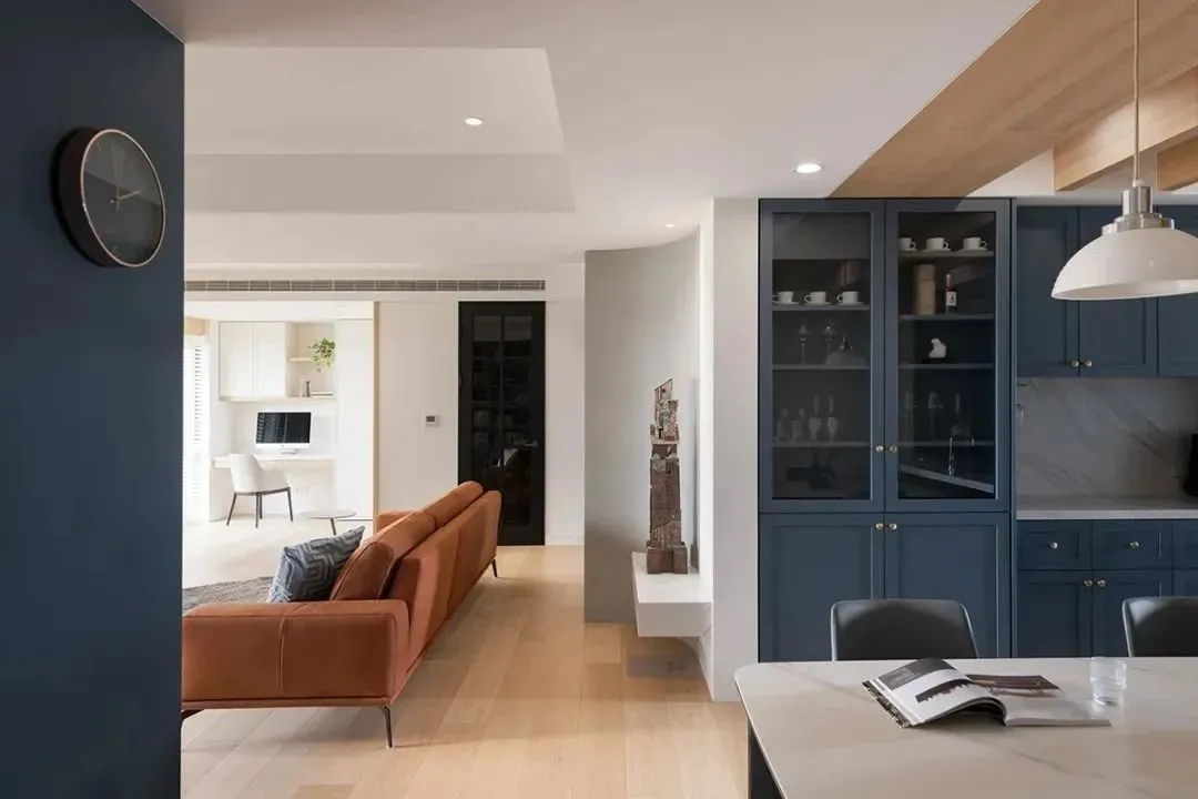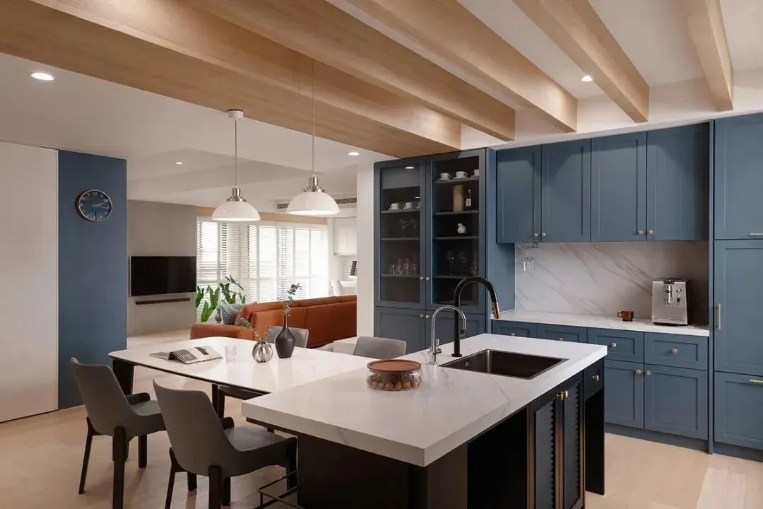 The ceiling of the living room is edged with wooden lines, and the sight is naturally guided to the dining room. The upper part of the restaurant is decorated with an atmospheric wooden grille, which perfectly defines the middle island and the dining table area. Continuing the gray-blue tone of the living room, the electrical cabinet is matched with textured thin bricks, which injects a modern American sense into the space.