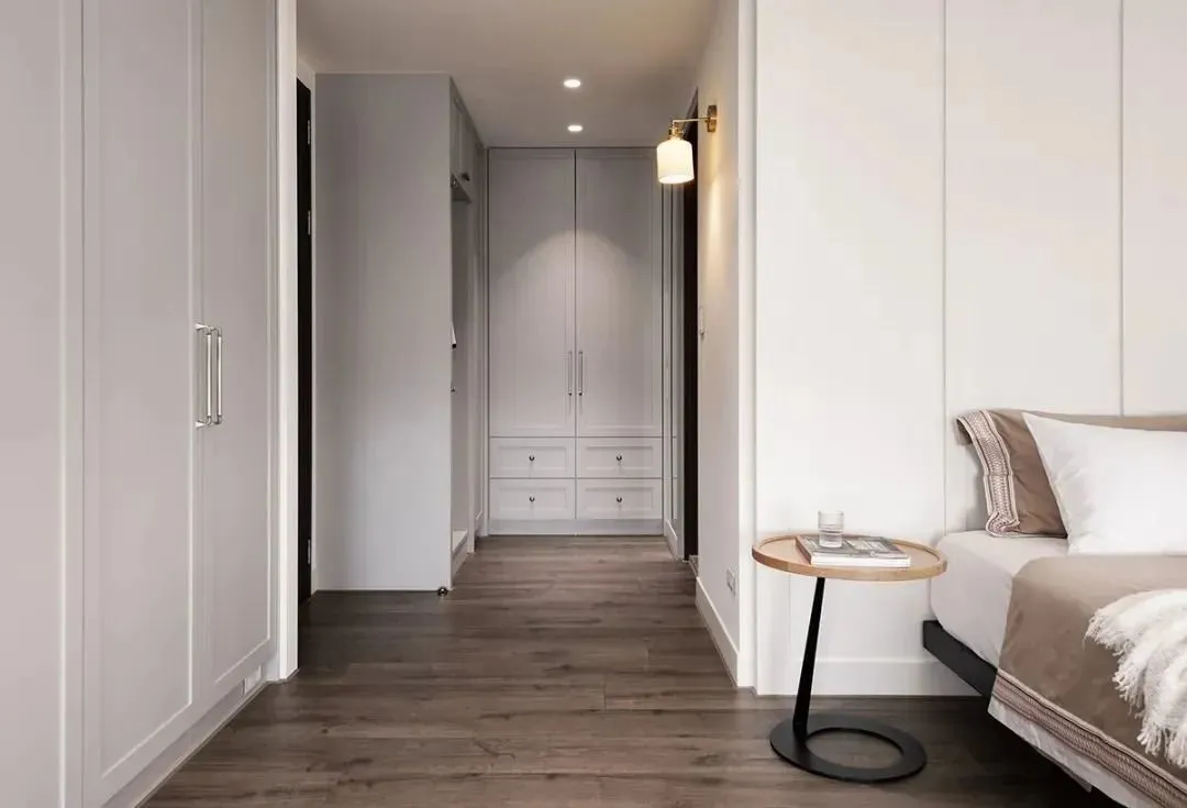 The master bedroom focuses on creating a peaceful sleeping atmosphere. When you open the door, first of all, it is an exquisite small porch. The cabinet follows the American line board shape, which is in the same strain as the style of the public area. The design of the bedside background wall is simple, and the vertical lines of deep and shallow grooves add a sense of detail. When the light falls on the pure white wall, it creates a peaceful and soothing sleeping environment.
