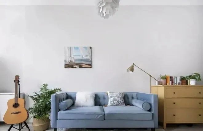 White walls and log floors set a refreshing tone, and light blue sofas with potted banyan trees instantly brighten the space. The three-story low cabinet hides a mystery: green plants are placed on the upper floor, sundries are stored on the middle floor, and a snack cabinet with rollers on the bottom floor! When friends come to a party, it immediately turns into a mobile bar ~