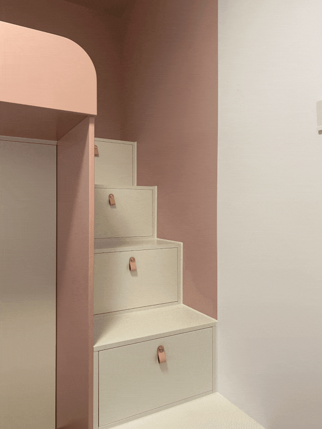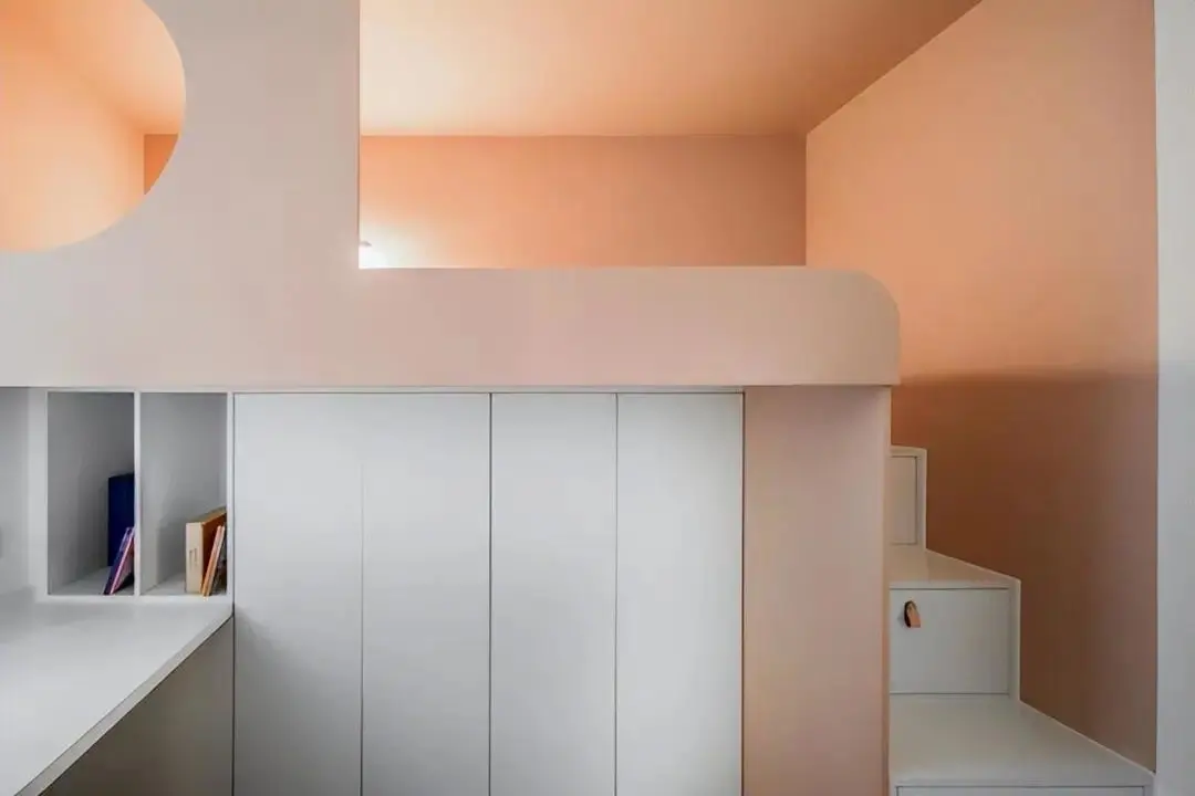 The children’s room is dominated by pink and white, and the high-low bed with stable structure is designed. The bed adopts a “box” shape, with cloud-shaped lights, which adds fun and safety.