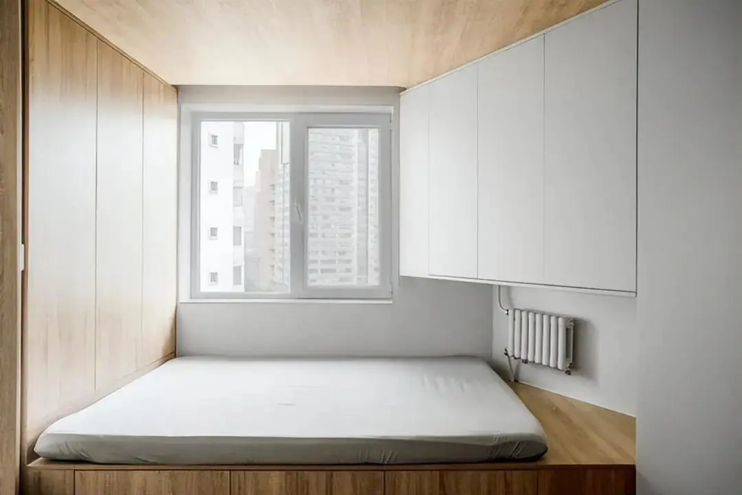 The master bedroom has a small area. By customizing the combination design of bed and wardrobe, it meets the dual needs of sleeping and storage, and improves the space utilization rate. After being connected with the adjacent balcony, a desk is placed, which solves the need of working from home.