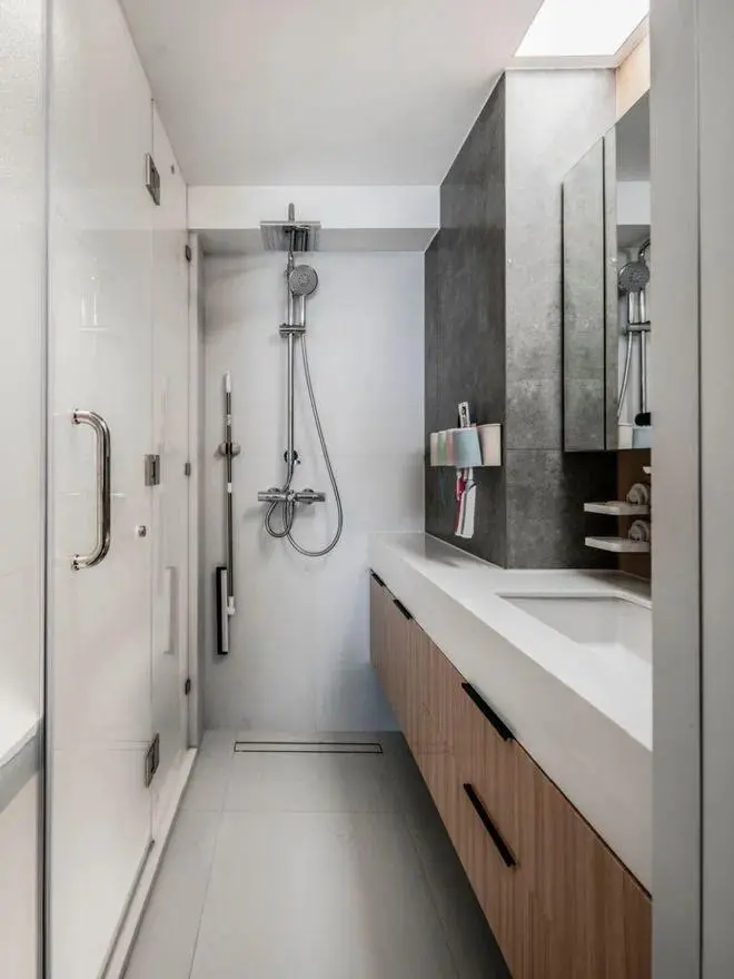 The bathroom adopts glass sliding door to realize wet and dry separation, which is convenient for five people to use. Double washing areas are set up, and the toilet area and shower area are also independent, which is convenient for families to wash during morning and evening peak hours without interfering with each other.
