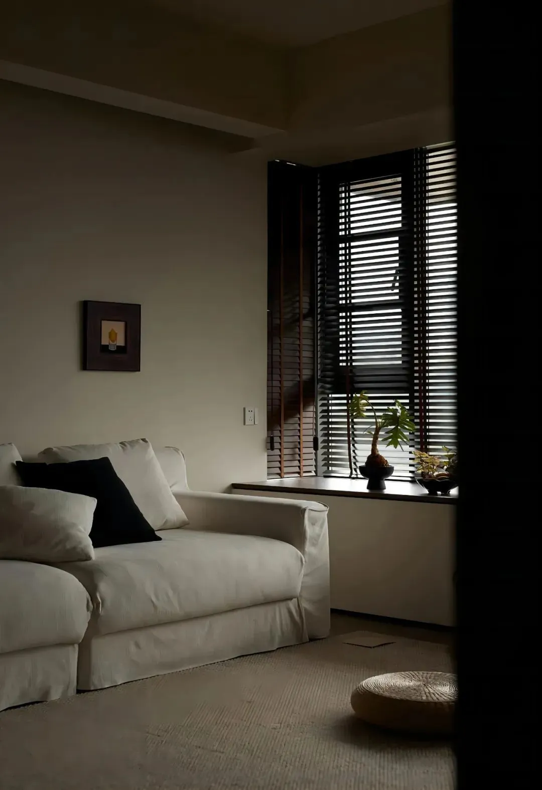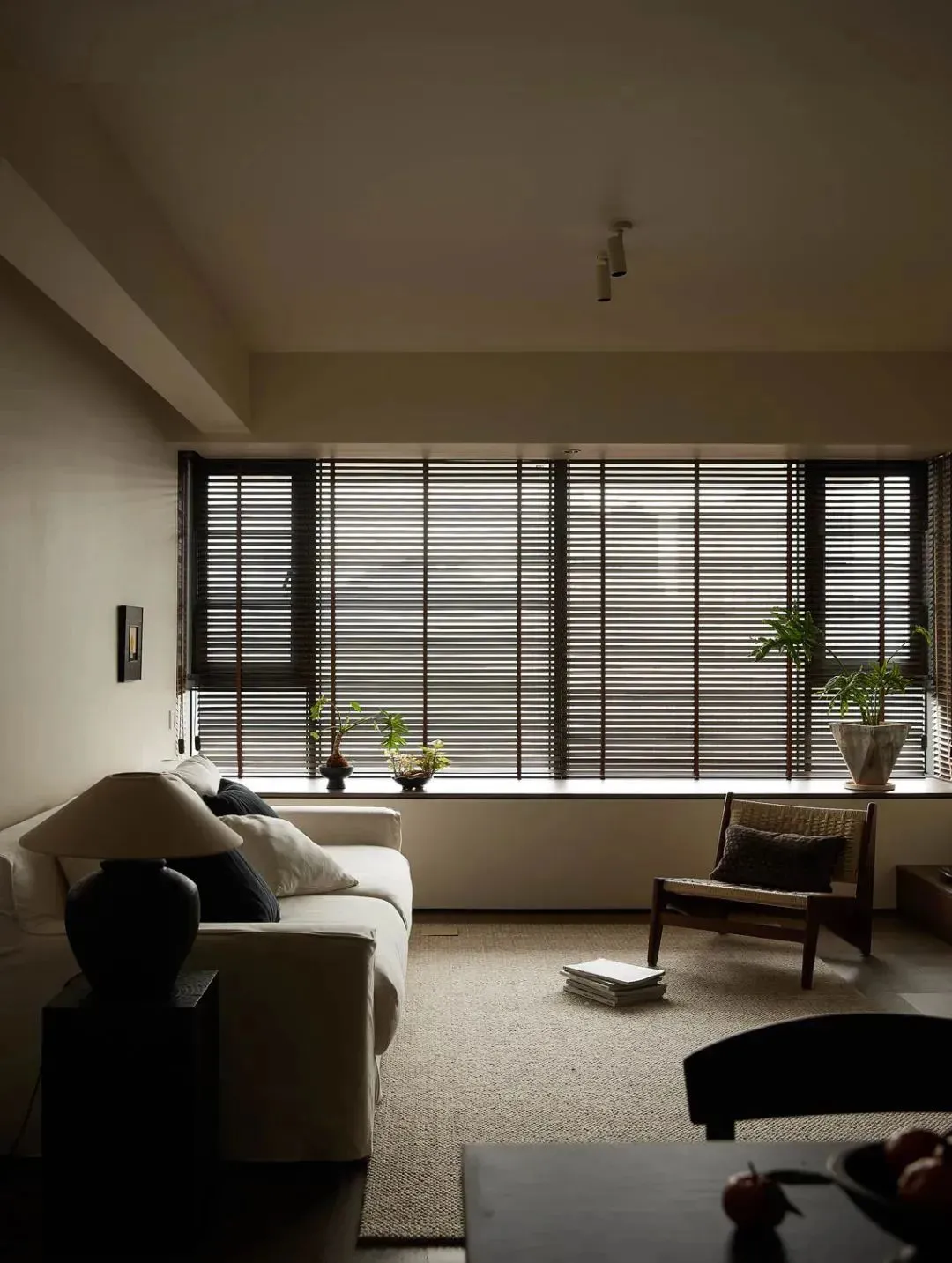 The living room is designed with no main lamp, which visually stretches the floor height. The wooden countertop adds a sense of warmth to the bay window, while the retro blinds allow the indoor light to be adjusted freely.