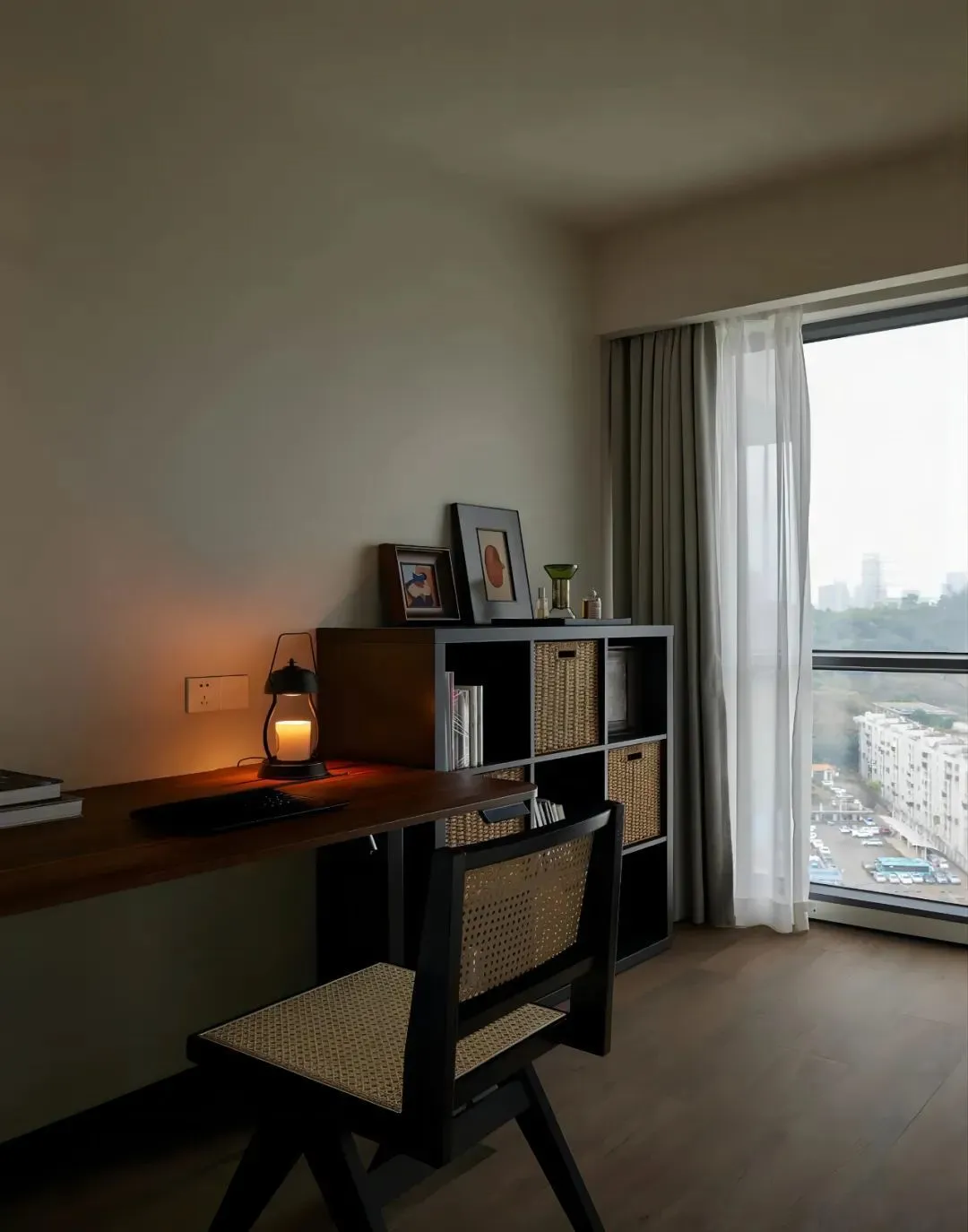 Solid wood desks, rattan chairs, drawer bookshelves and simple decorative paintings, decorated with lighting, jointly create a nostalgic and exquisite texture.