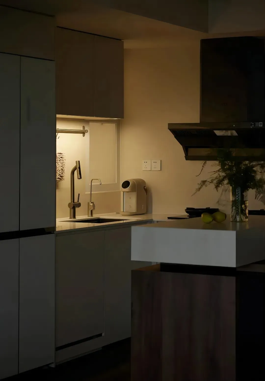 The entrance hall adopts a curved partition wall design. Compared with the traditional right angle, the curved shape is visually softer and more soothing. Paired with a sensor light strip, the ritual feeling of returning home is instantly full.