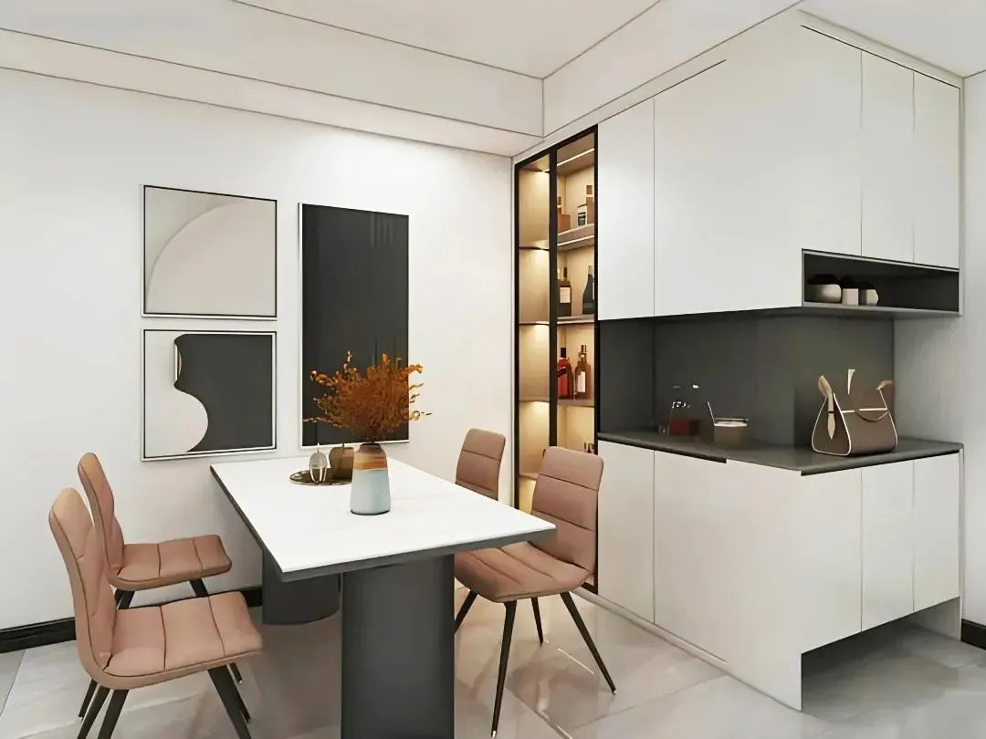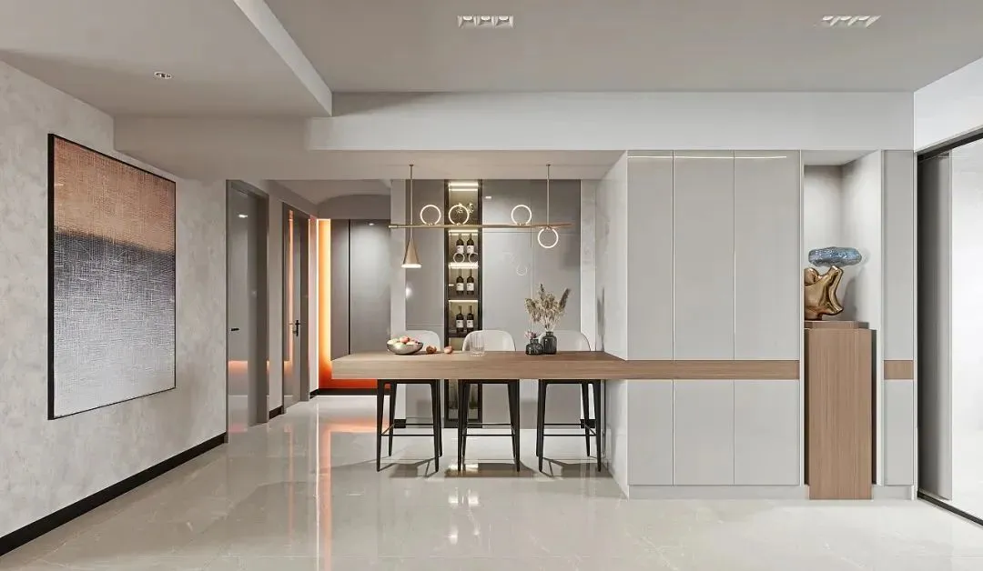 If the dining room area is small, you can also connect the entrance cabinet to customize the suspended dining table. This not only saves the space occupied by the independent dining table, but also adds a personalized style to the restaurant.