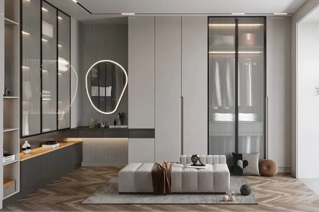 Of course, in addition to the extended design, you can also install the dressing table directly in the reserved position inside the wardrobe. When customizing the wardrobe, you can plan a space in advance and design a storage compartment with drawers as a dressing table, which has strong integrity and saves space.