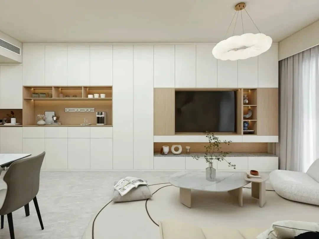 Customize the whole wall of TV cabinet and sideboard to create an integrated guest and dining room. This can not only improve the storage capacity of the dining room, but also visually extend the living room, making the small space appear more spacious.