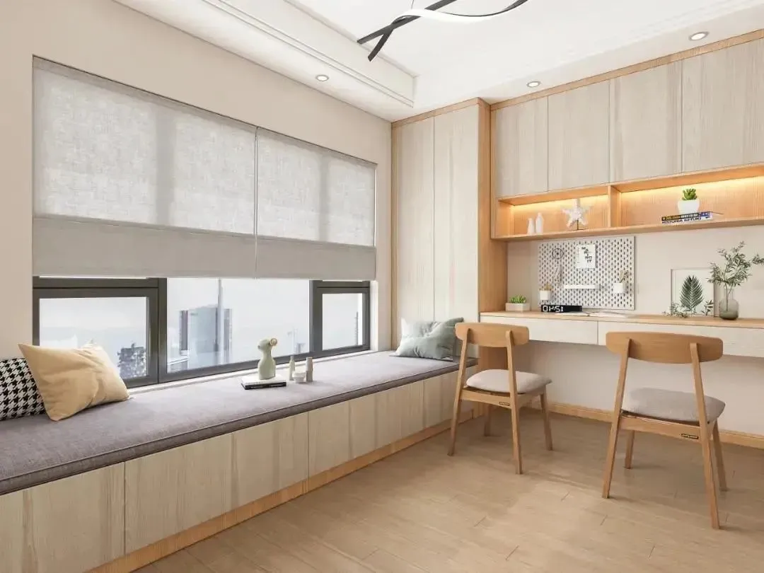 Building a bay window cabinet by the window can expand the storage space, and you can sit on it to rest and relax after laying soft cushions. By customizing the bookcase and desk against the bay window cabinet, a study office area is formed. For families without independent study, it can be used as an open study ~