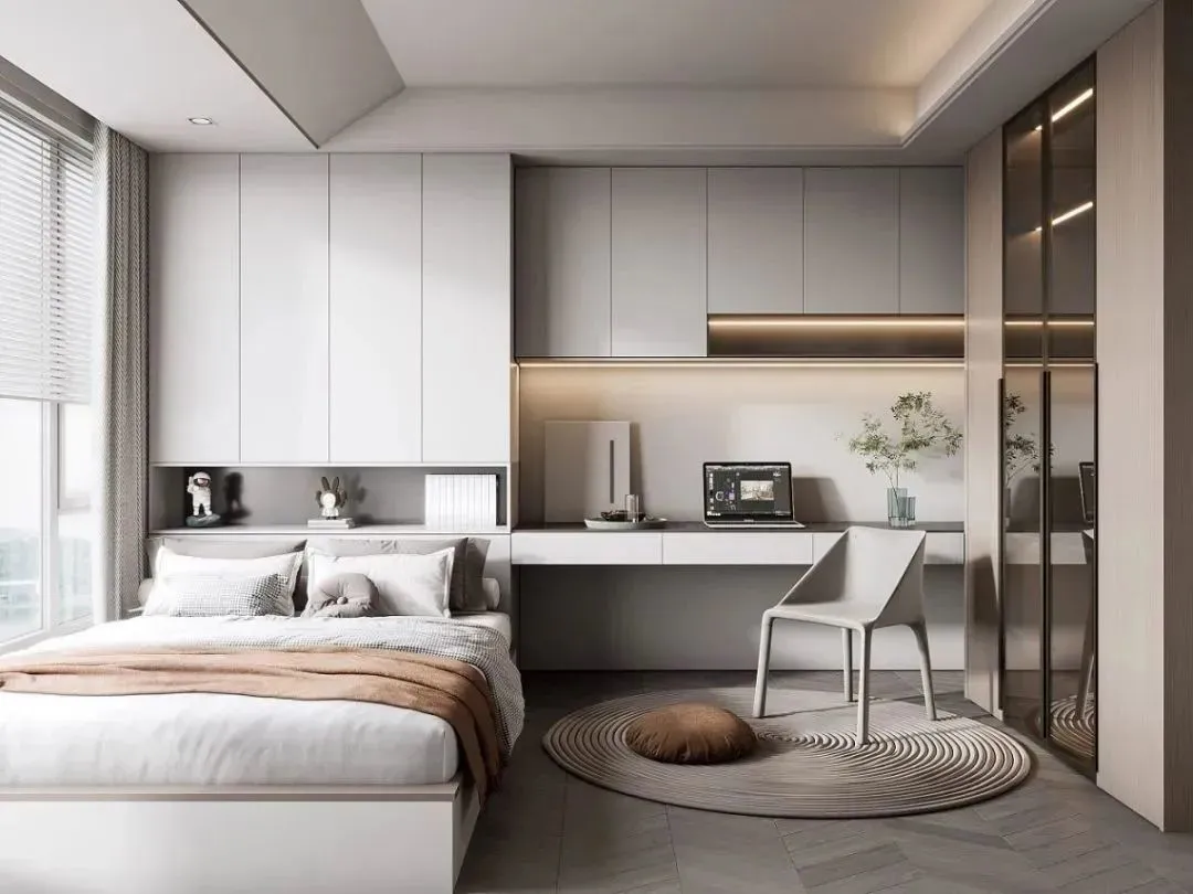 The wardrobe customized to the top in the bedroom has a large storage capacity and a simple and elegant appearance. Extending the dressing table of the same color to the concave position of the corner, the integrated design makes full use of the corner space, and the style is more coordinated and unified than the dressing table purchased separately.
