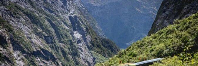 Here you will pass a suspension bridge, and there is parking space before crossing the bridge. The suspension bridge was built in the 1940 s, and the sidewalk is separated from the driveway. You can take pictures on the sidewalk after parking. On the right side of the window, you can see the highest peak in Fiordland National Park-Mount Tutok (2724 meters above sea level), which is covered with snow all year round.