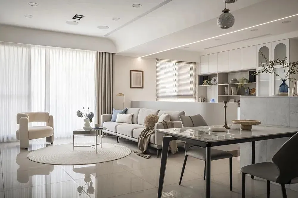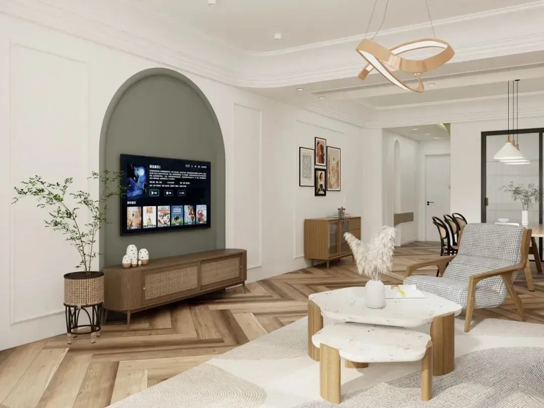 The common practice is: the cabinets, doors and wainscoting in the living room should be as consistent as possible in color and texture to form a unified facade. The color of the dining table, dining chairs and coffee table can be slightly darker than that of the cabinet, but the color still needs to be uniform, and clean and delicate texture should be selected to avoid rough and messy. It is best to choose a light-colored and clear-textured style for the floor, and the carpet is also an indispensable matching element.