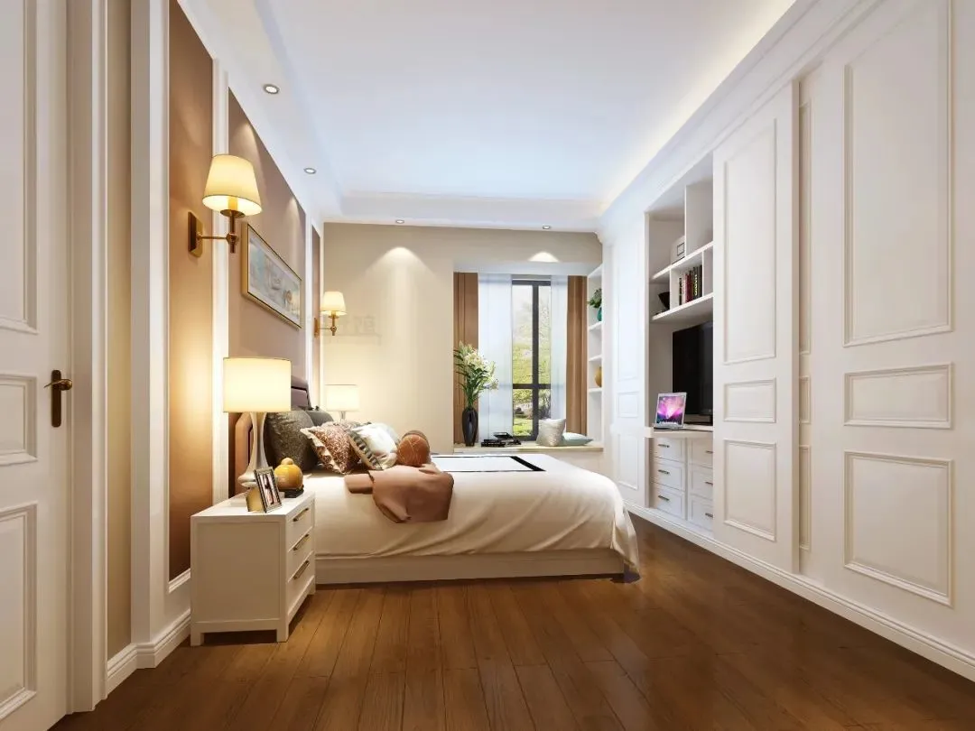 The most comfortable viewing position is when people lean against the head of the bed and the TV is facing the end of the bed. But if the whole wardrobe needs to be made at the end of the bed, the installation of the TV becomes a difficult problem. At this time, you can consider combining the TV with the wardrobe design, such as reserving an embedded TV position in the middle of the sliding door wardrobe.