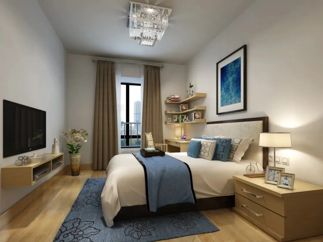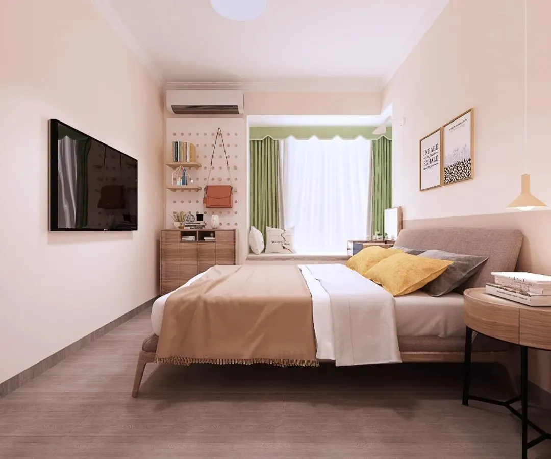 Similarly, when there is no wardrobe at the end of the bed, if the floor space is limited and the cabinet cannot be placed, you can choose to hang the TV on the wall. Nowadays, TVs are very thin and light, and wall-mounted installation takes up almost no space, which is very suitable for smaller bedrooms.