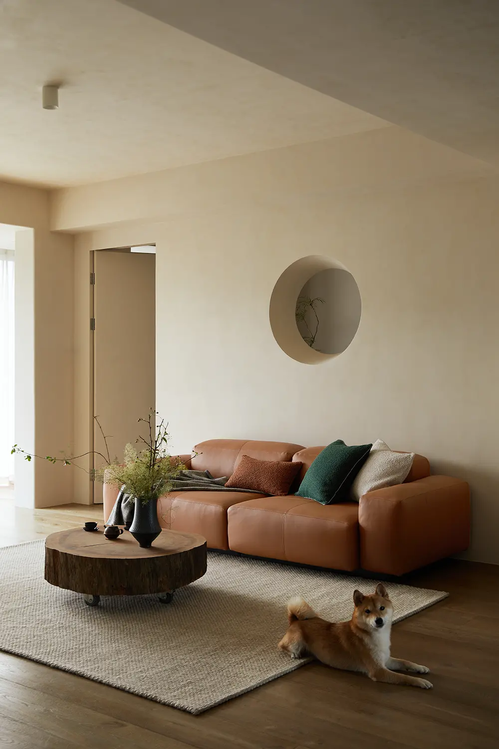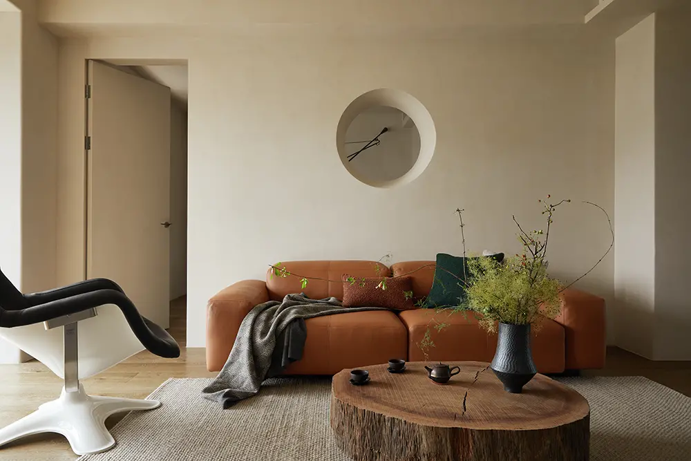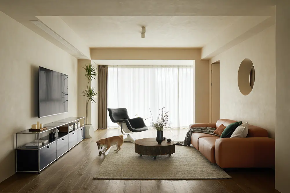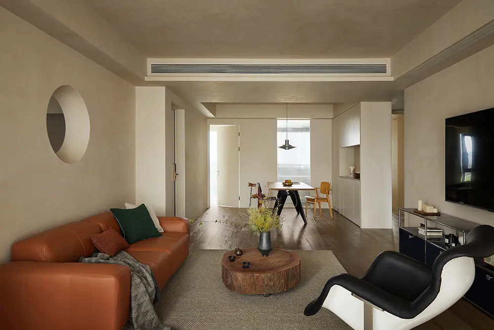The edge of the TV wall adopts soft arc transition, the sofa wall is designed with round shaped niches, and the ceiling is decorated with regular linear lines. These elements are combined with seemingly random furniture, adding a sense of order to the free and romantic space.