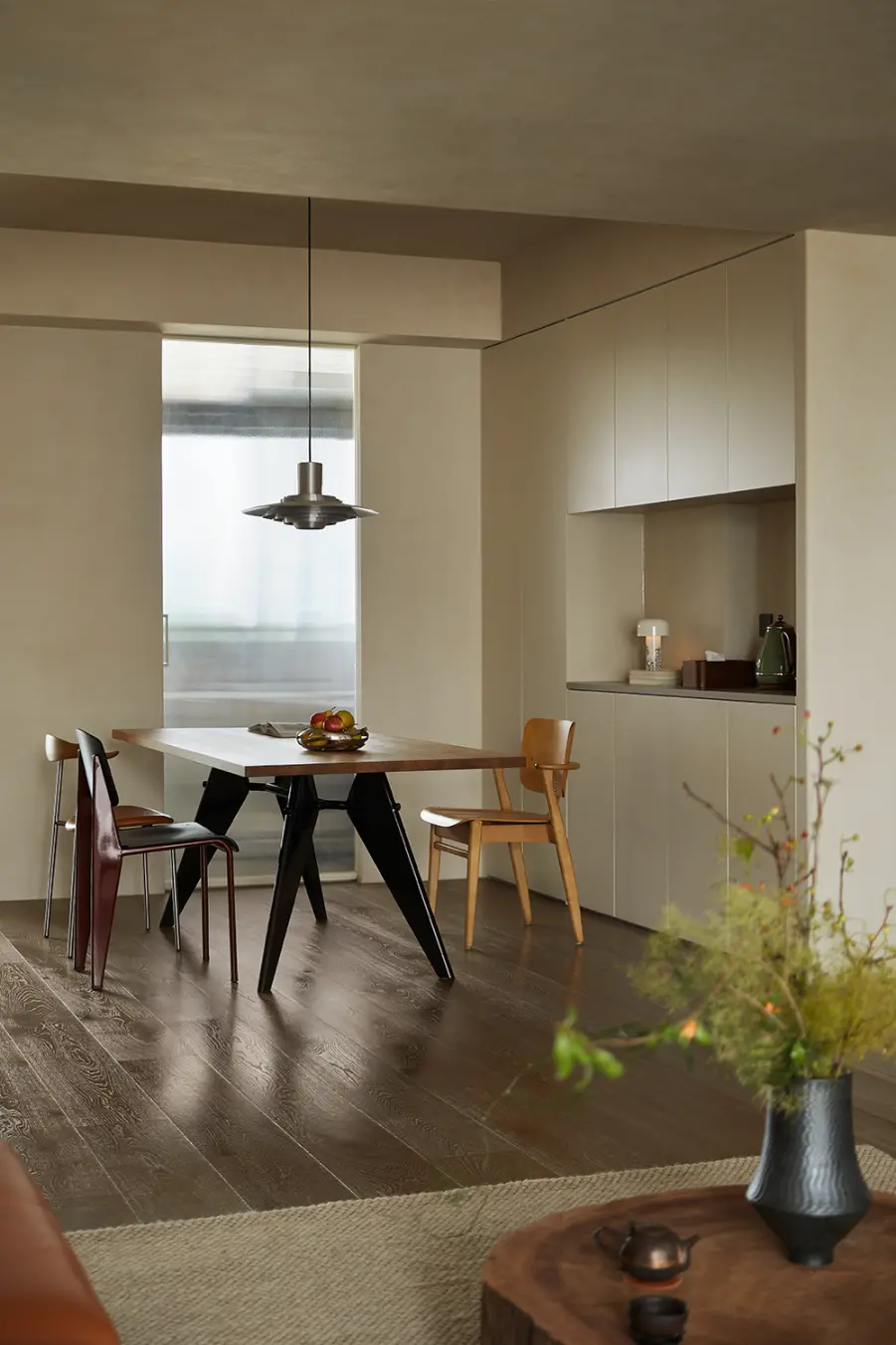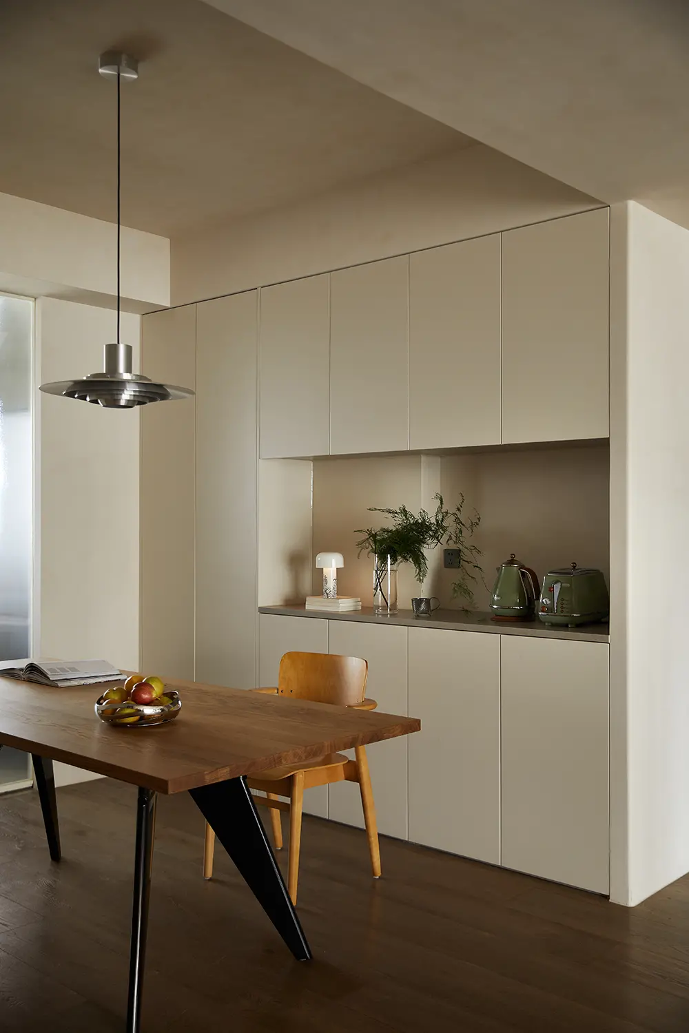 The design without main lamp, the wooden floor with warm texture, the milk tea-colored hand-made texture paint, and some decorations with wabi-sabi charm jointly create a leisurely and romantic atmosphere… A variety of retro elements are used to depict the nostalgic background color, embellished with a few modern elements, which exquisitely achieves the harmonious unity of retro style and modernity.
