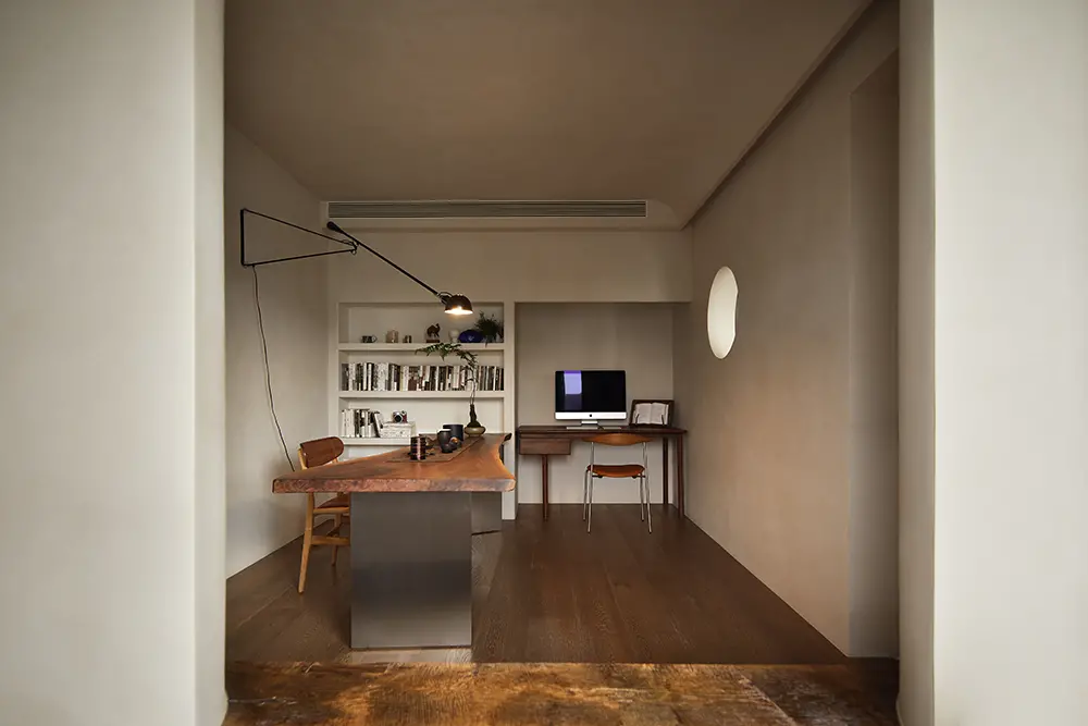 Next to the desk are open alcove-style storage racks that are simple and rustic without losing taste. The other side is connected with the balcony, and only one window can skillfully construct the beautiful artistic conception of “the window contains panoramic view”.