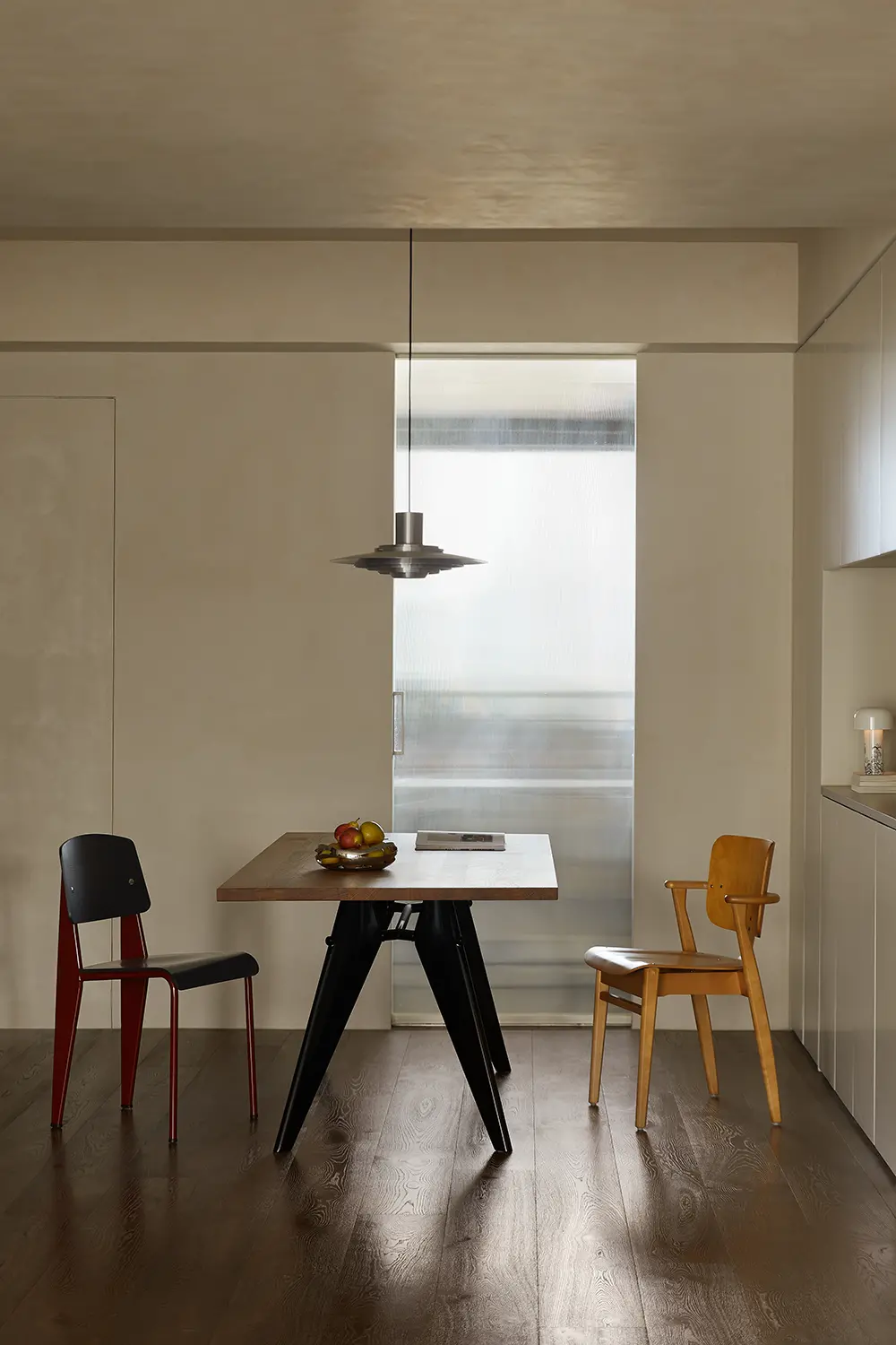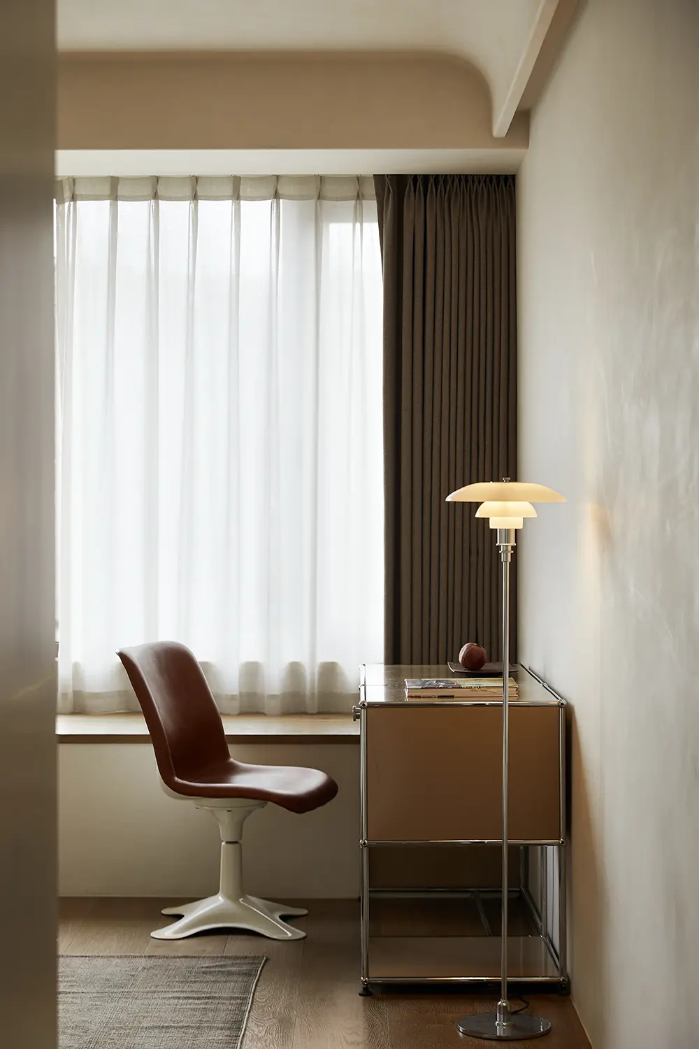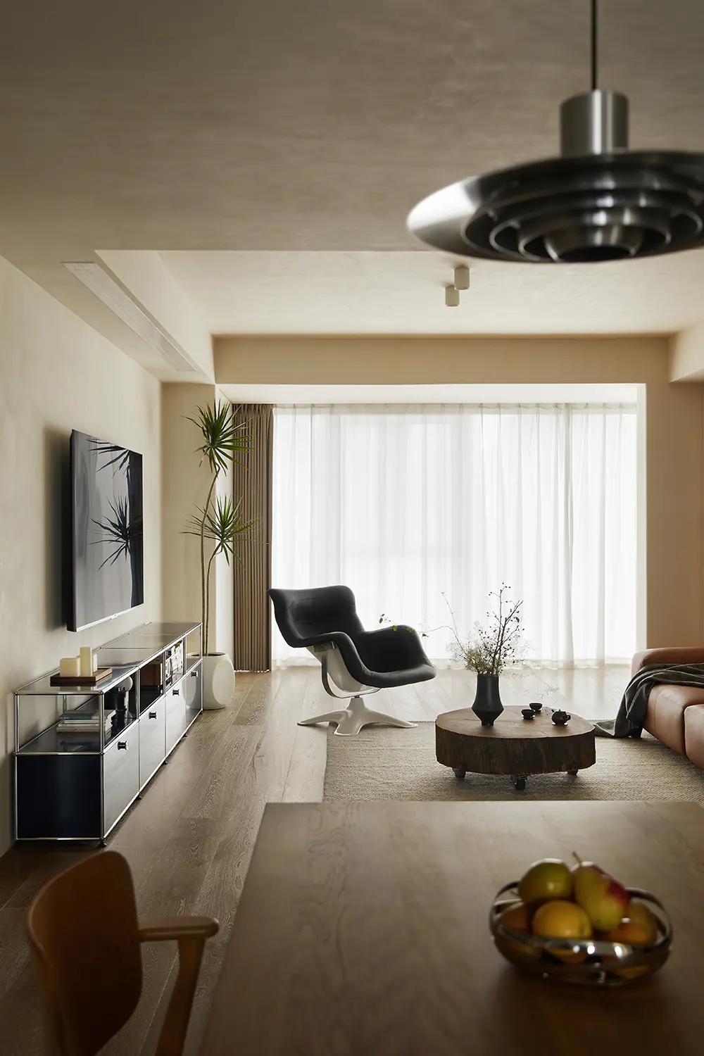The sunlight passed through the gauze curtains, casting wonderful light and shadow in the room. Under the reflection of warm lights, the whole home is like a retro movie picture, which makes the space naturally exude a warm and cordial atmosphere.